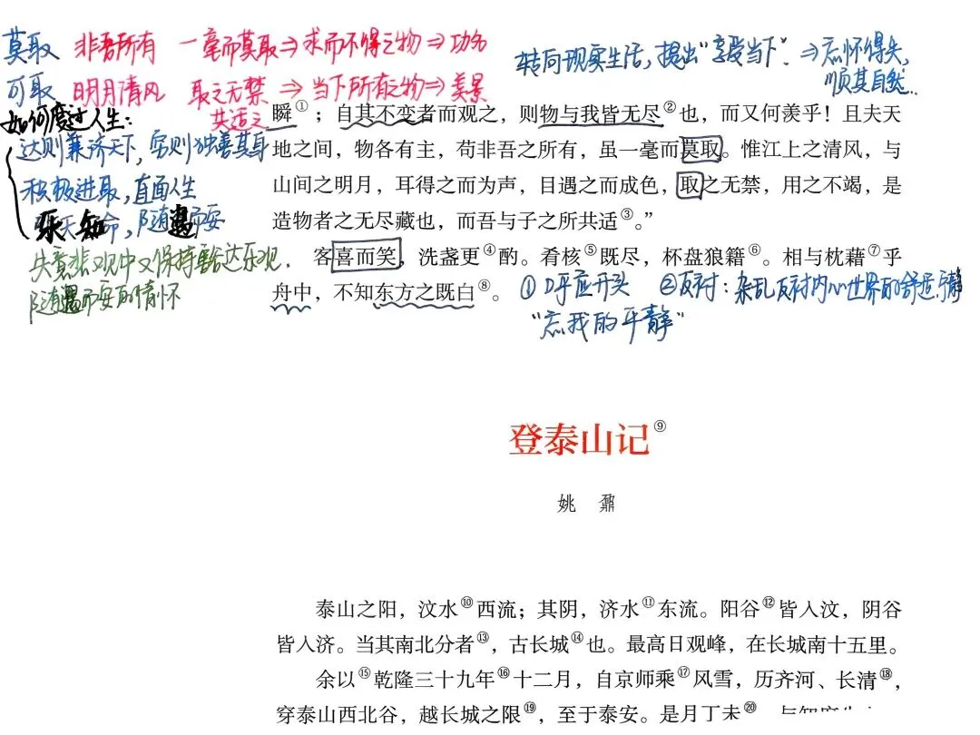 教师总结:“全文以‘情感变化’为线索,从月夜泛舟之乐,到怀古伤今之悲,再到辩证顿悟之喜,展现了苏轼的心灵突围。他融合儒释道思想:儒家‘拿得起’(济世报国),道家‘想得开’(辩证豁达),佛家‘放得下’(超然物外),最终形成‘乐观而不圆滑,入世而不拘泥’的人生态度。”