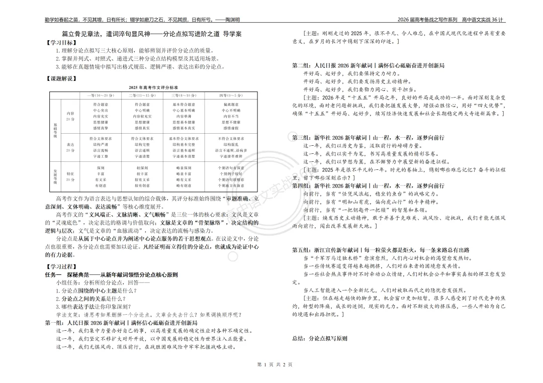 同学们,今天我们一同探寻了议论文的“风骨”奥秘。从新年献词中提炼原则,在范式建构中掌握模型,于真题实战里淬炼笔锋。希望你们记住:分论点不仅是结构的“骨架”,更是思想的“风骨”;它既要逻辑严密如精准的榫卯,也要文采飞扬如点睛的波澜。愿你们将今日所学——并列的广度、对照的深度、递进的力度——内化为思维的利剑,在未来的考场上,既能构建清晰有力的论证框架,更能让文章因深刻独到的思想而真正站立起来。下课!