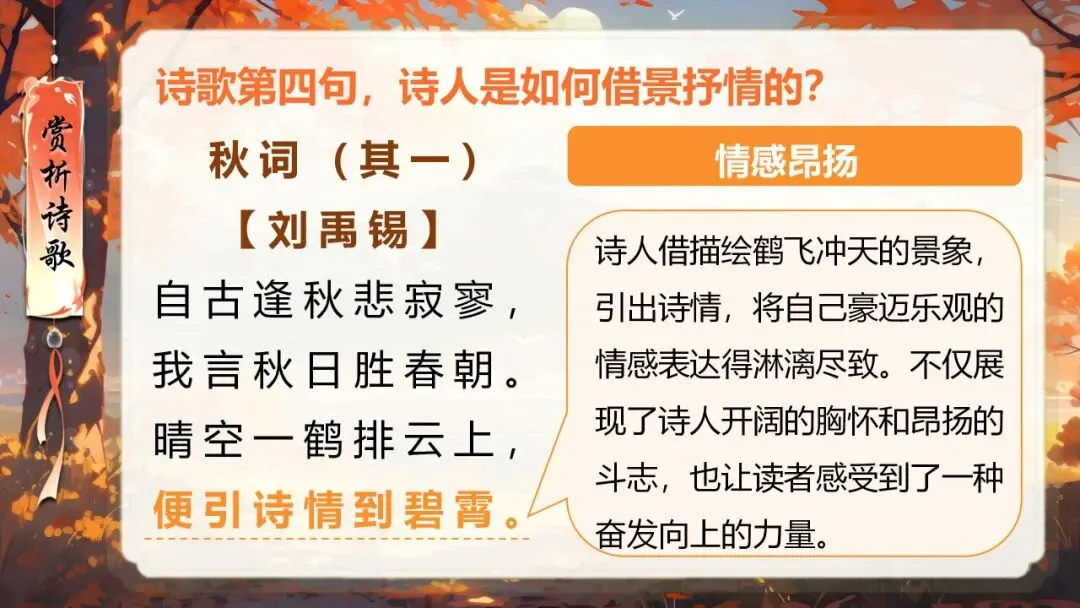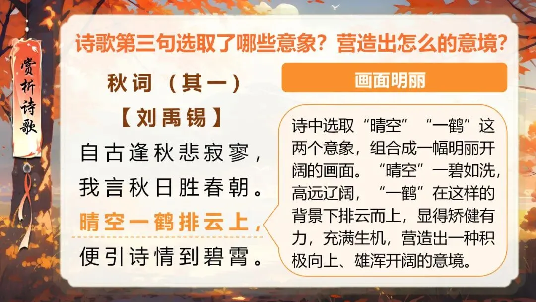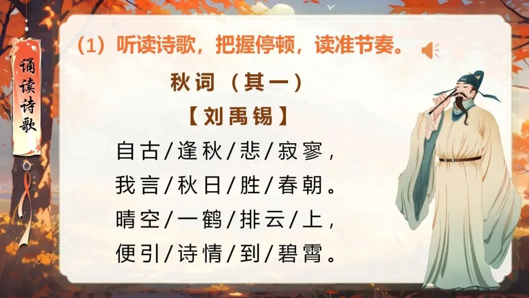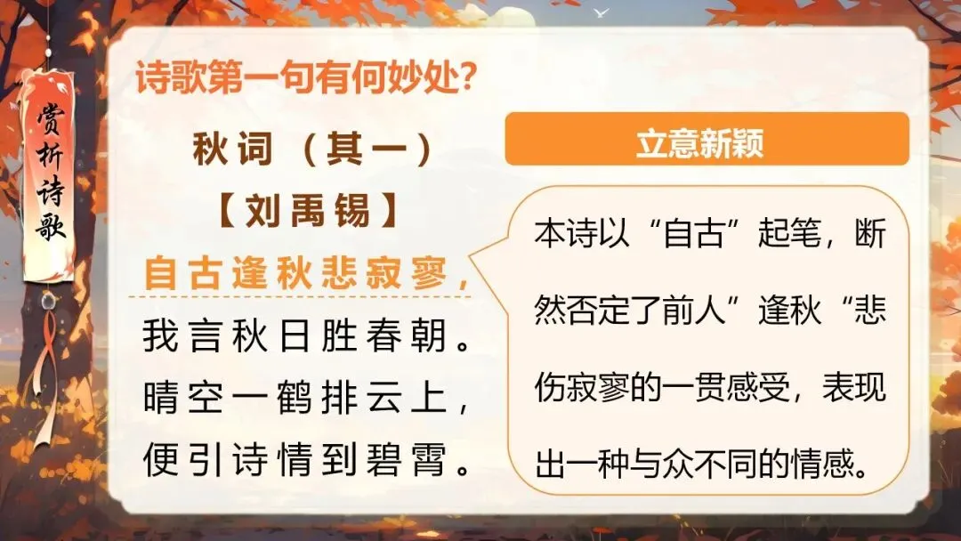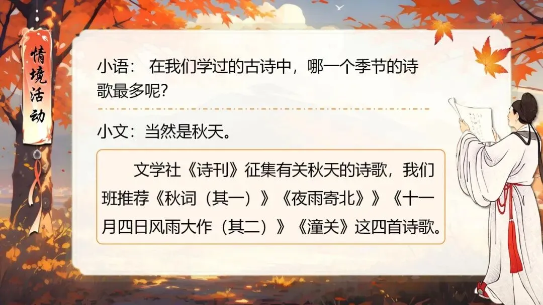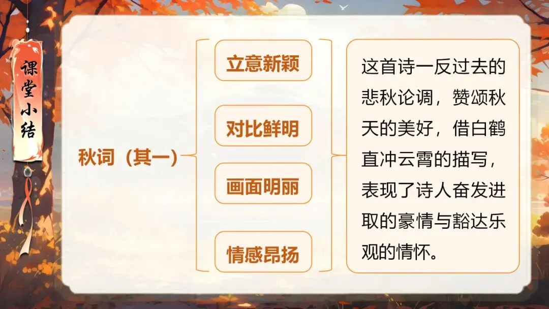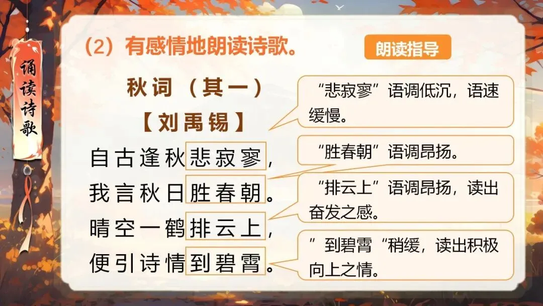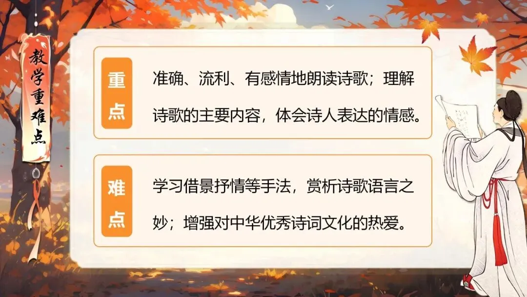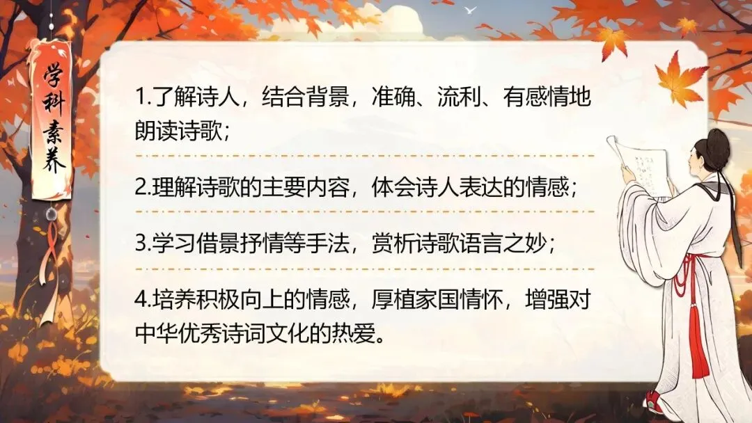 本课所涉及的诗歌分别选自唐、宋、清四位诗人的四首诗歌,这四首诗歌均为七言绝句,且描绘的季节都是秋天。因此,在教授本课时,可以从秋天的诗意入手,指导学生准确、流利、有感情地朗读诗歌,理解诗歌的主要内容;并结合背景,体会诗人表达的情感;培养学生积极向上的情感,厚植家国情怀,增强对中华优秀诗词文化的热爱。