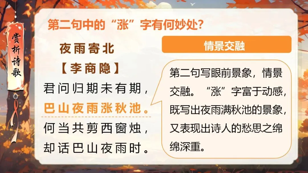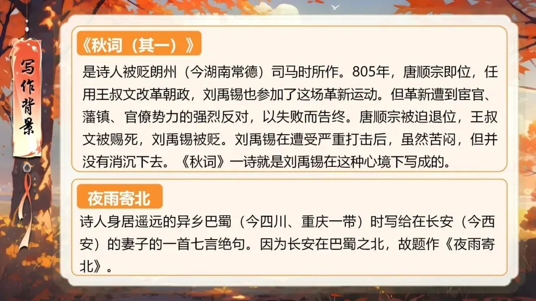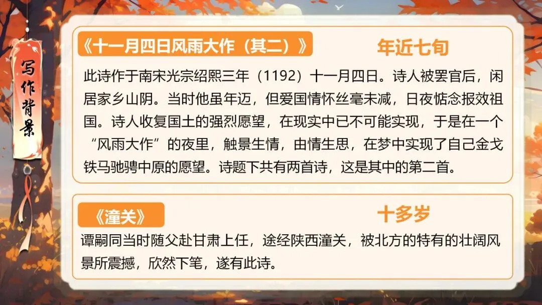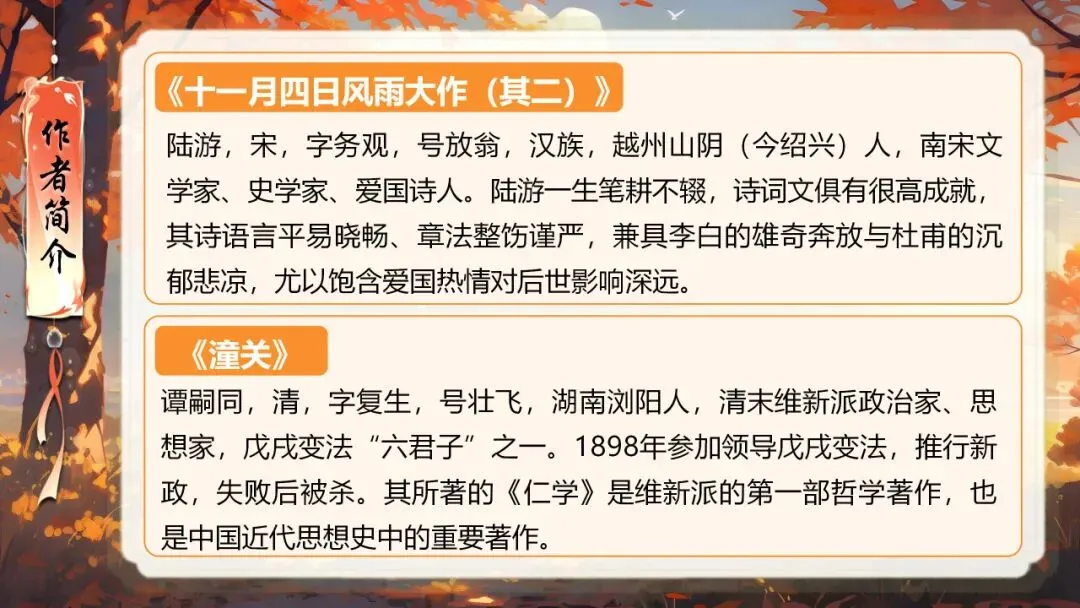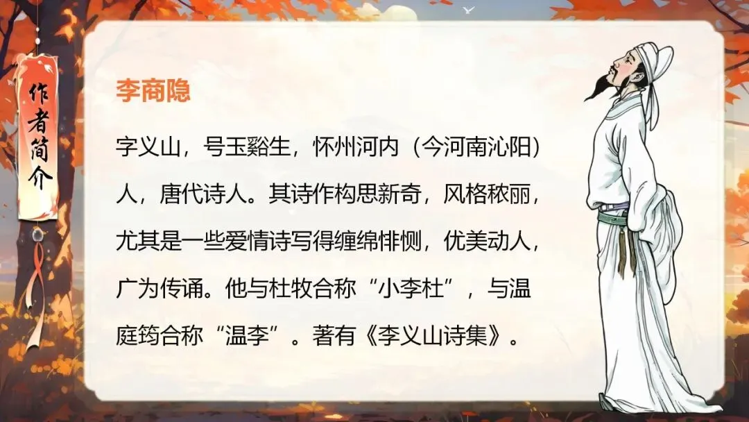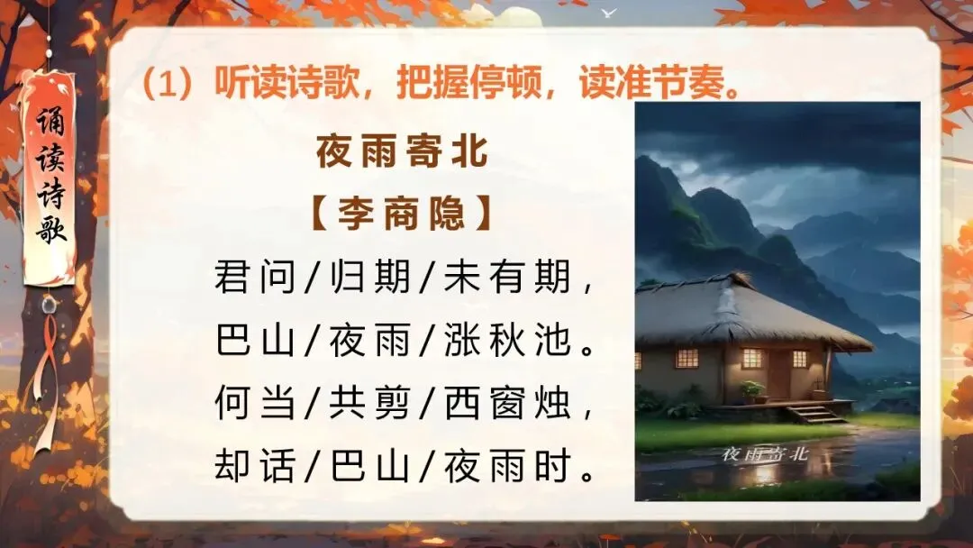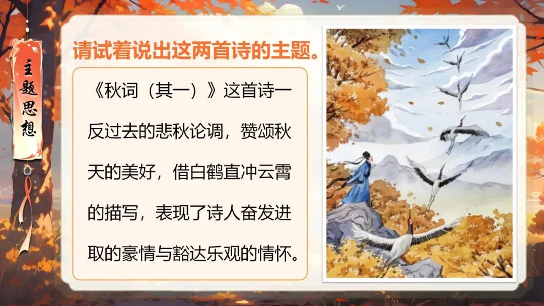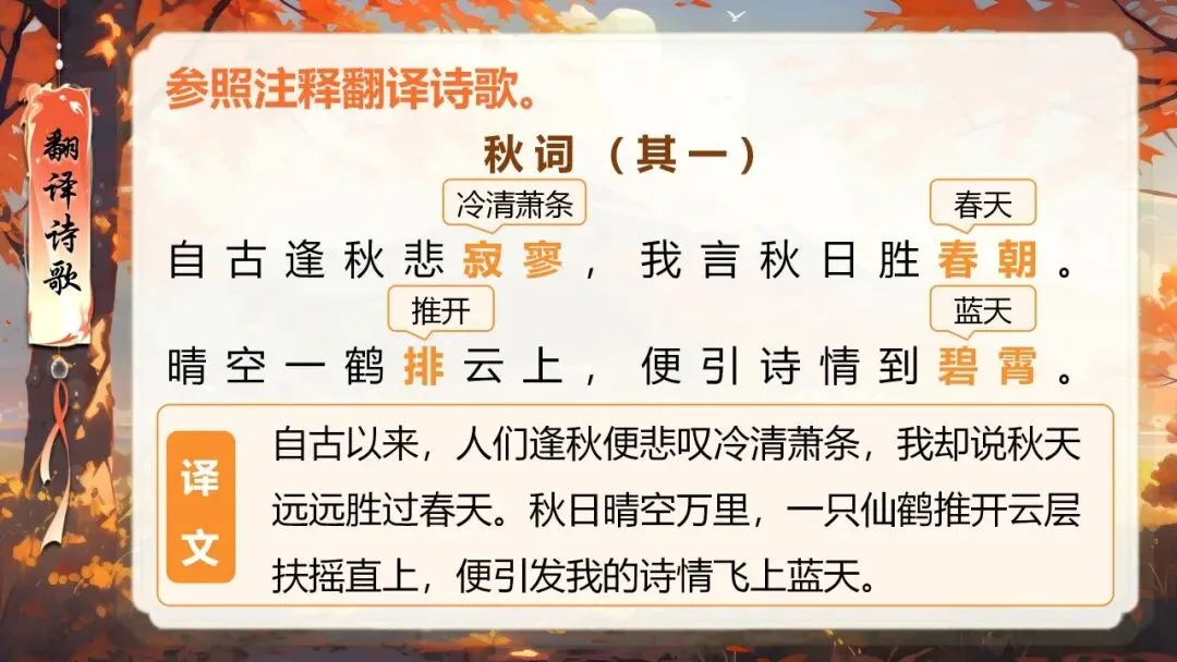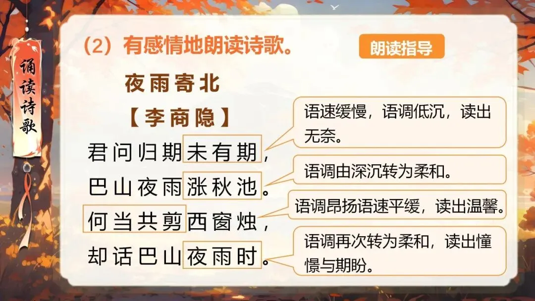 本课所涉及的诗歌分别选自唐、宋、清四位诗人的四首诗歌,这四首诗歌均为七言绝句,且描绘的季节都是秋天。因此,在教授本课时,可以从秋天的诗意入手,指导学生准确、流利、有感情地朗读诗歌,理解诗歌的主要内容;并结合背景,体会诗人表达的情感;培养学生积极向上的情感,厚植家国情怀,增强对中华优秀诗词文化的热爱。