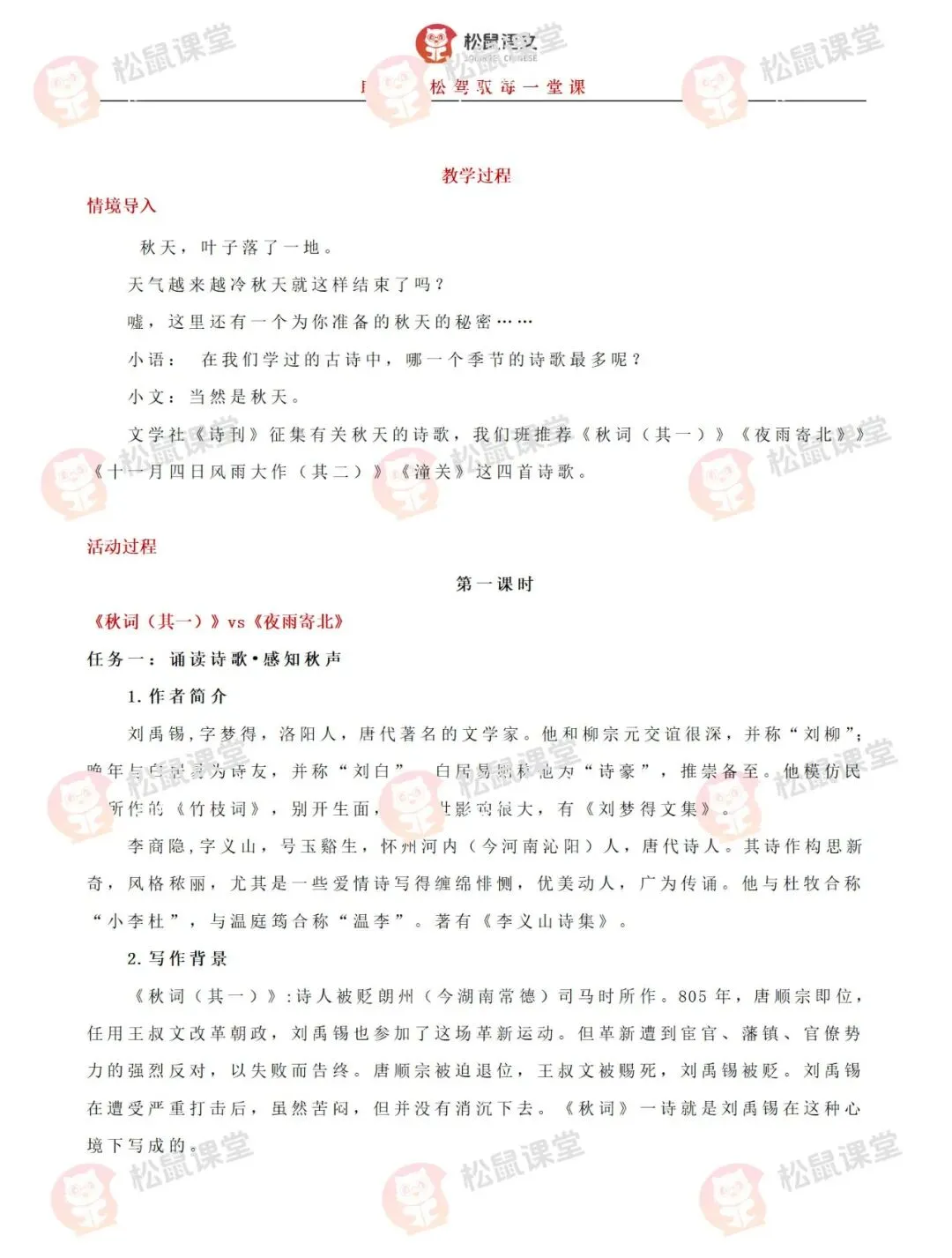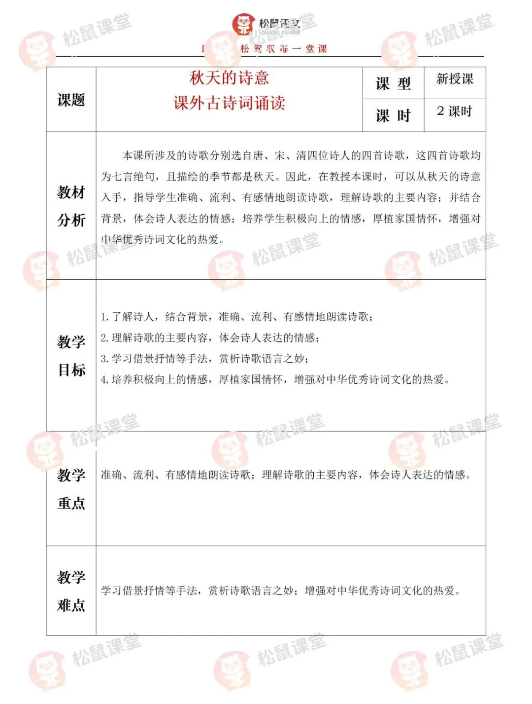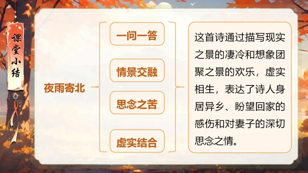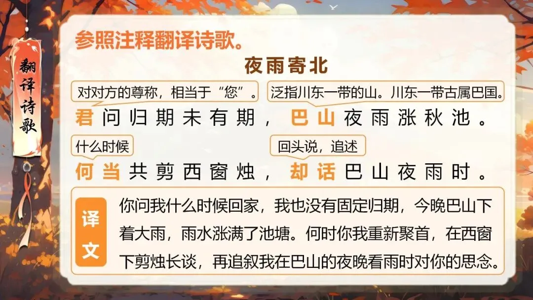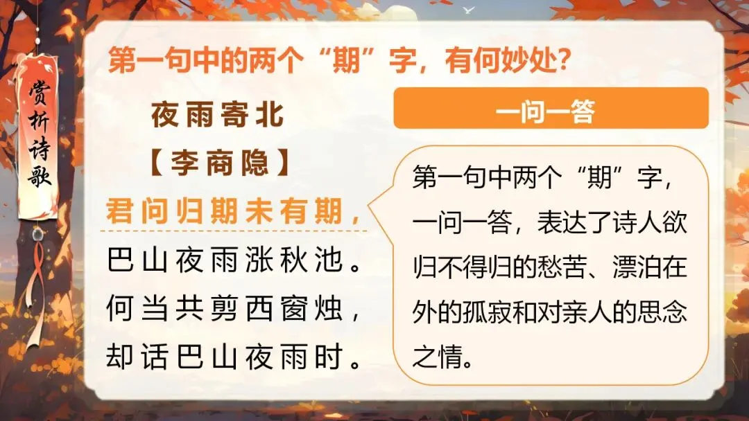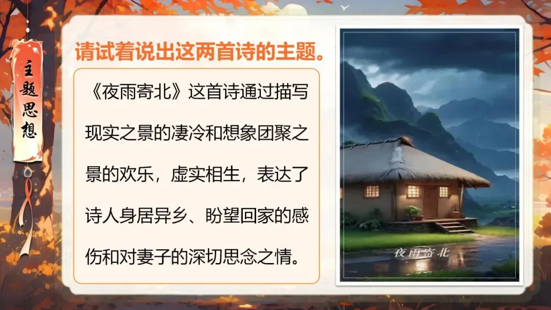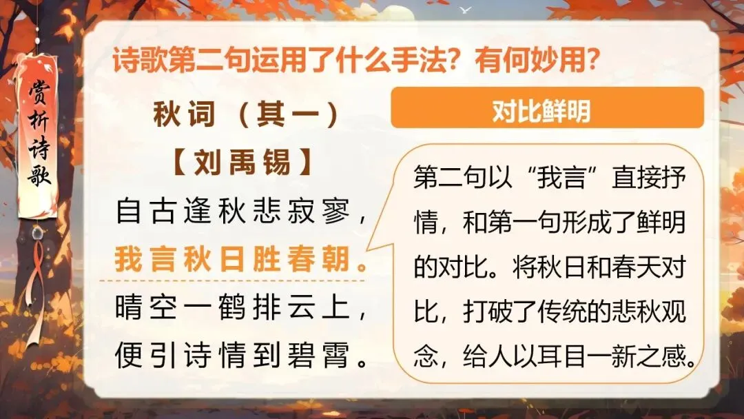 本课所涉及的诗歌分别选自唐、宋、清四位诗人的四首诗歌,这四首诗歌均为七言绝句,且描绘的季节都是秋天。因此,在教授本课时,可以从秋天的诗意入手,指导学生准确、流利、有感情地朗读诗歌,理解诗歌的主要内容;并结合背景,体会诗人表达的情感;培养学生积极向上的情感,厚植家国情怀,增强对中华优秀诗词文化的热爱。