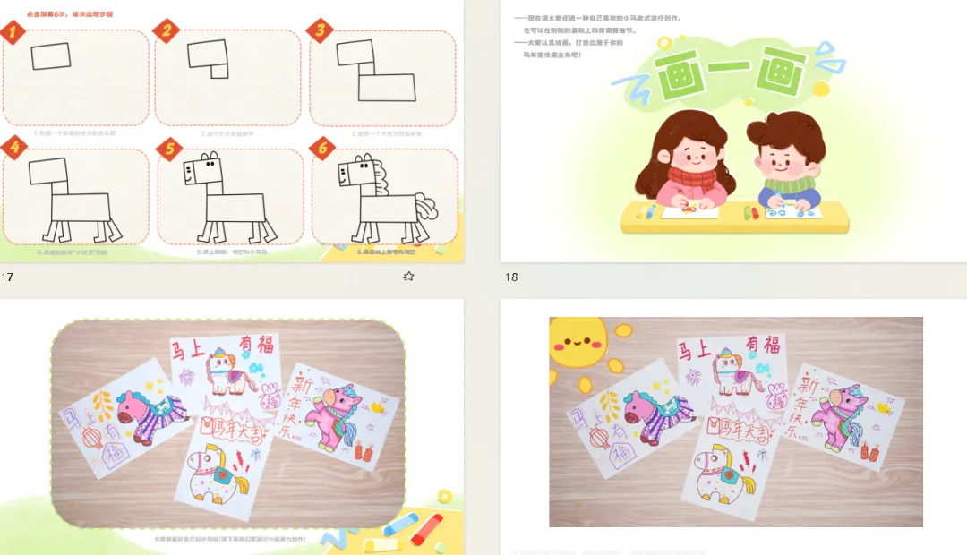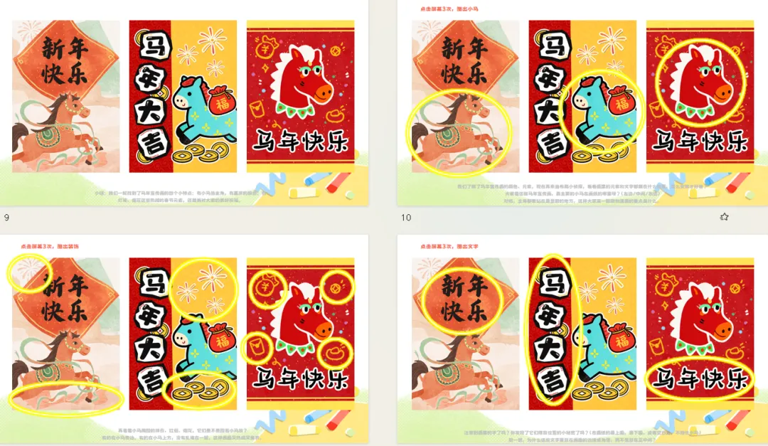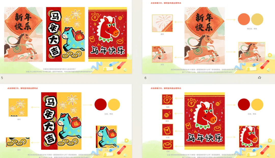 小结:我们一起找到了马年宣传画的四个小特点:有小马当主角,有喜庆的颜色;有灯笼、烟花这些热闹的春节元素,还藏着对大家的美好祝福。