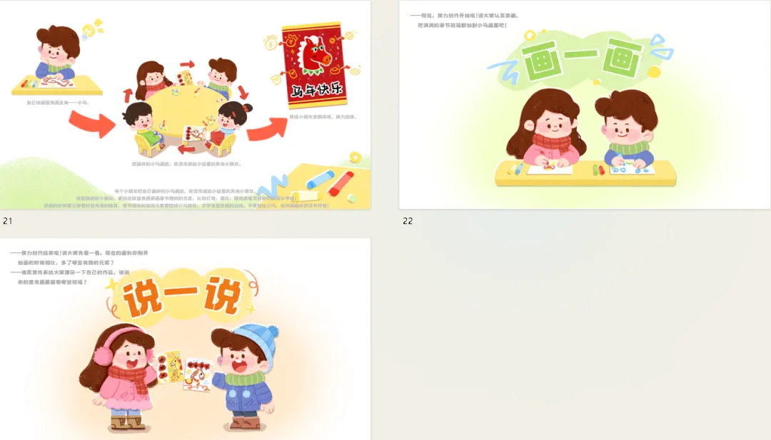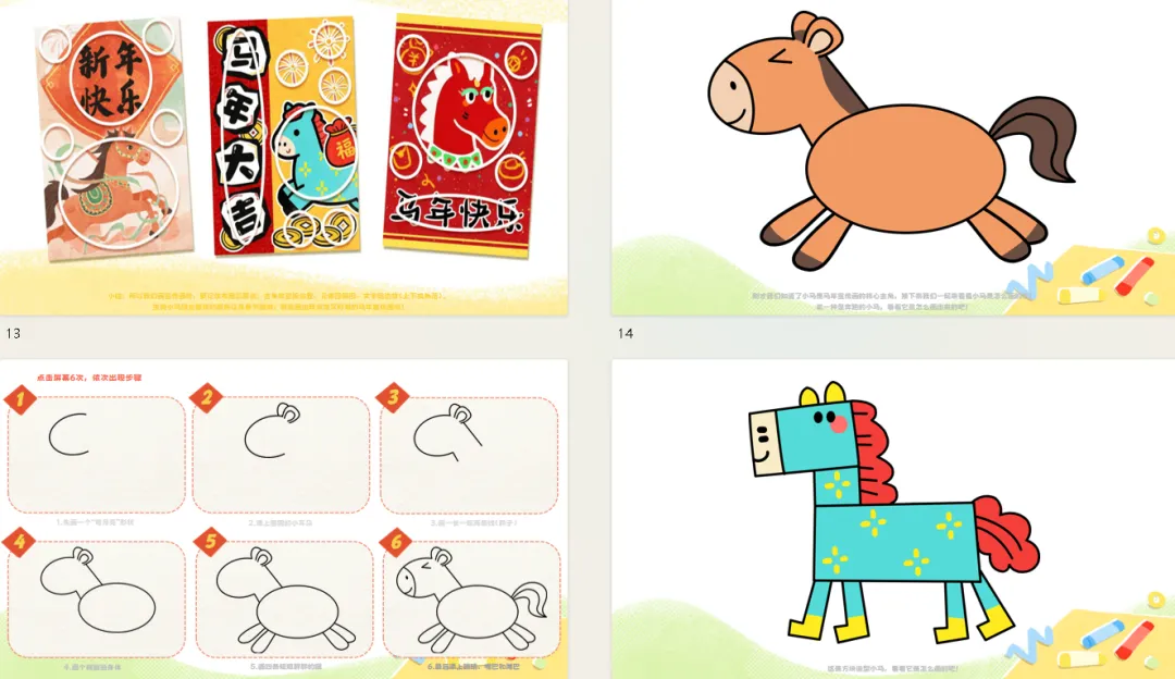 ——注意到画里的字了吗?比如新年快乐、马年大吉,它们没挡着小马,要么在画纸的最上面,要么在最下面,要么在空白的角落。——文字要清楚好认,还不能抢主角的风头,就像给画面加个小标题。小结:所以我们画宣传画时,要记住布局三要点:主角放显眼位置、元素围周围、文字贴边放(上下或角落)。再加上开心的小马、热闹的颜色、春节的小装饰,就能画出既清楚又好看的马年宣传画啦!