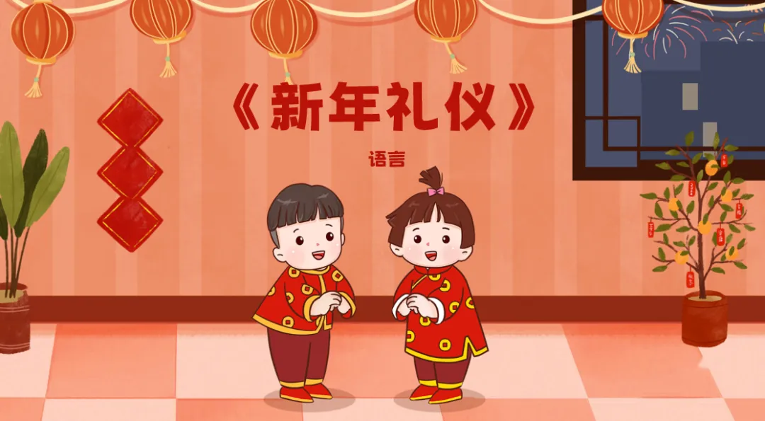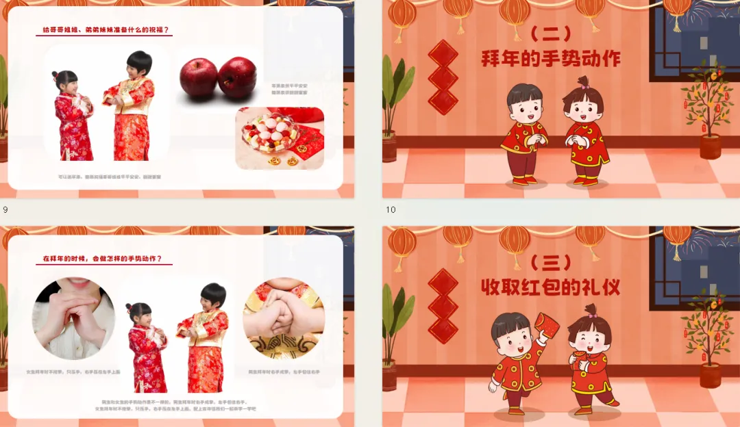 小结:男生和女生的手势动作是不一样的,男生拜年时右手成拳,左手包住右手。女生拜年时不抱拳,只压手,右手压在左手上面。配上吉祥话我们一起来学一学吧