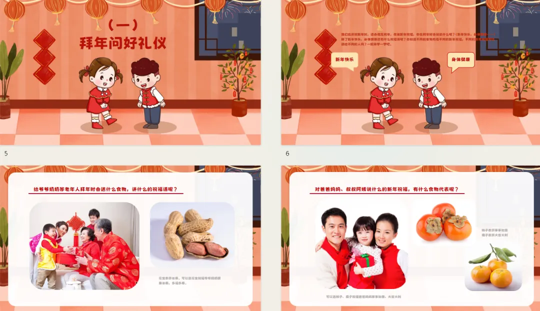 师:除了新年快乐,身体健康还有什么祝福语呢?你知道不同的食物有着不同的新年祝福,不同的新年祝福可以送给不同的人吗?一起来学一学吧。