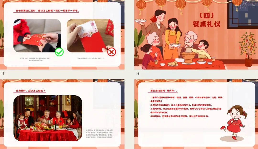 小结:收到红包时,我们需要双手接过并表示感谢,并交给爸爸妈妈保管。千万不能向长辈讨要红包、当面拆开红包,这些是不礼貌的行为。
