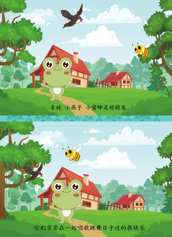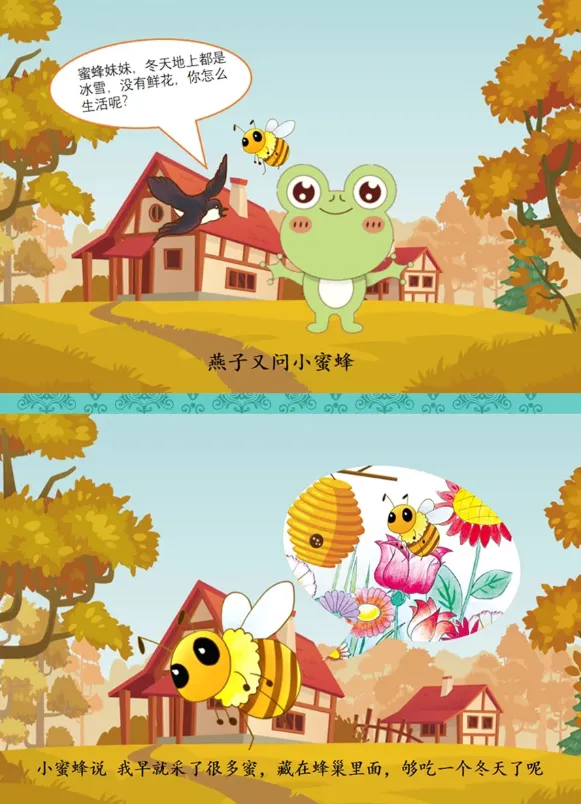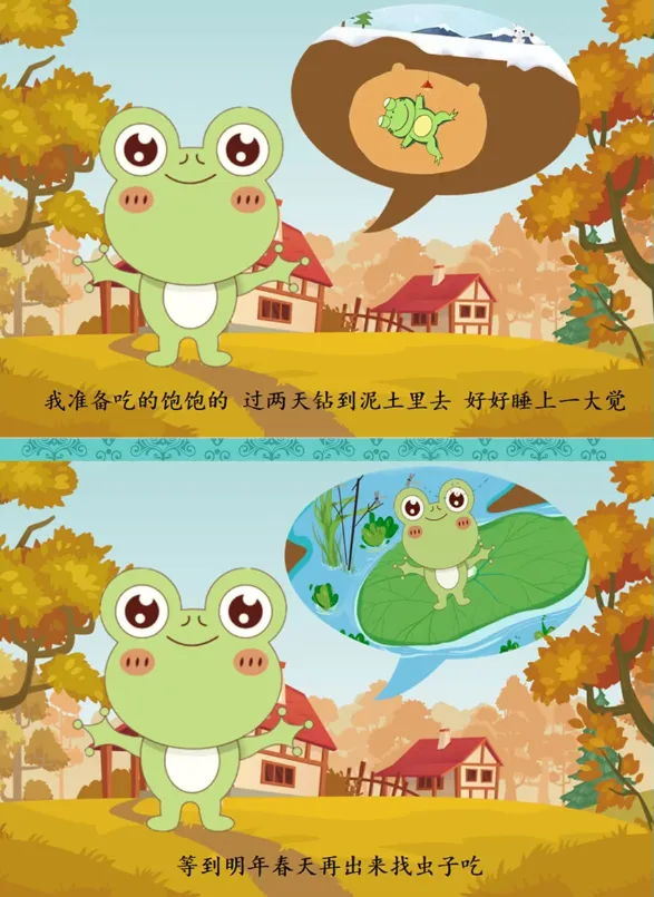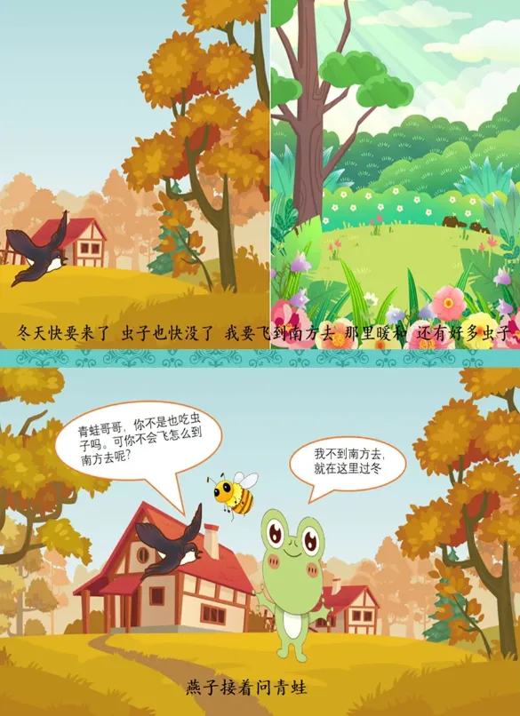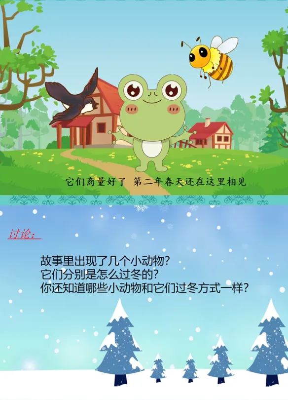 二.听故事,初步了解动物过冬的几种方式幼儿带着"故事中出现了几个小动物,分别是什么?""故事中的小动物是怎样过冬的?"两个问题听故事,初步了解故事中动物的过冬方法。小蚂蚁为过冬存储食物,青蛙冬眠,小燕子飞到南方去。