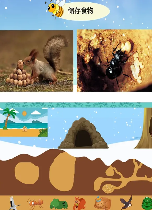 1.储存食物:蜜蜂、蚂蚁、松鼠