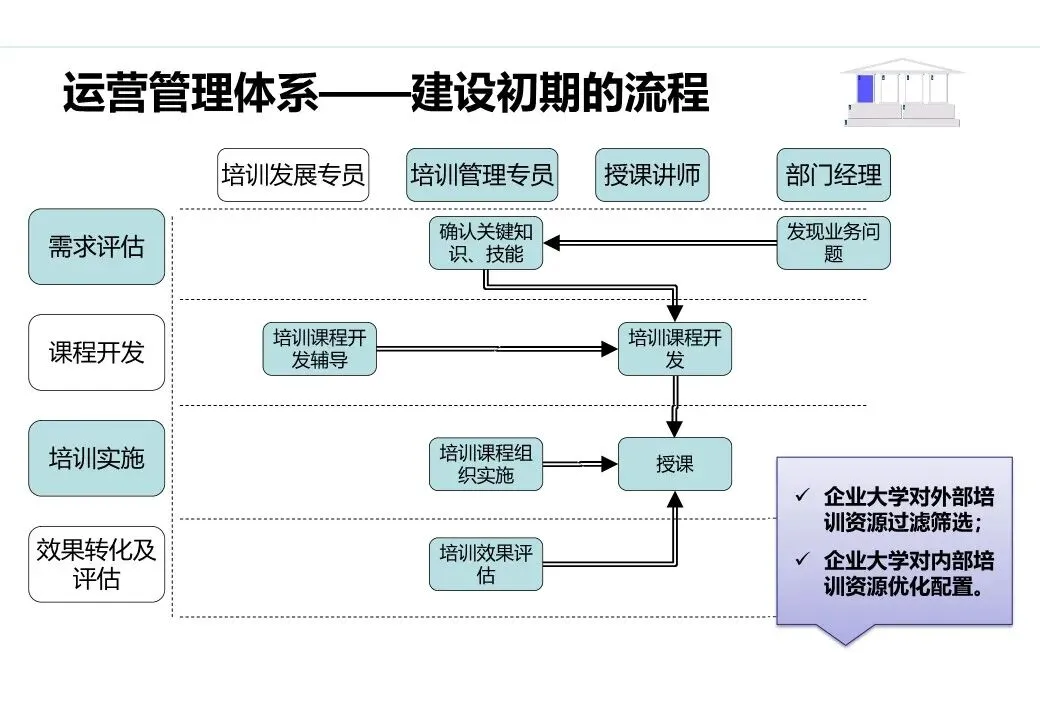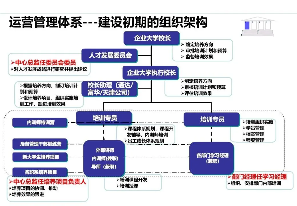 明确企业大学的组织定位与汇报关系,确保企业大学拥有足够的运营自主权;配备专职人员(如课程研发师、培训经理、知识管理员),并根据发展阶段逐步扩充团队;建立清晰的岗位职责体系与考核机制,提升团队执行力。