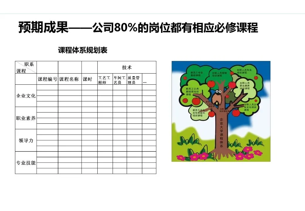 核心体系:完成核心岗位(如销售、技术、管理岗)胜任力模型搭建,初步构建“新员工入职培训+核心岗位基础培训”课程体系,开发20套核心课程。