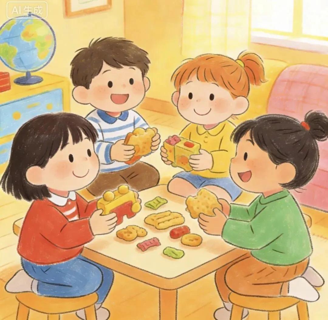 3. 教师小结:“一个人玩玩具,只有‘1份孤单’;和朋友分享,就能得到‘好多份快乐+好多朋友’——分享就像魔法,能让快乐变多!”