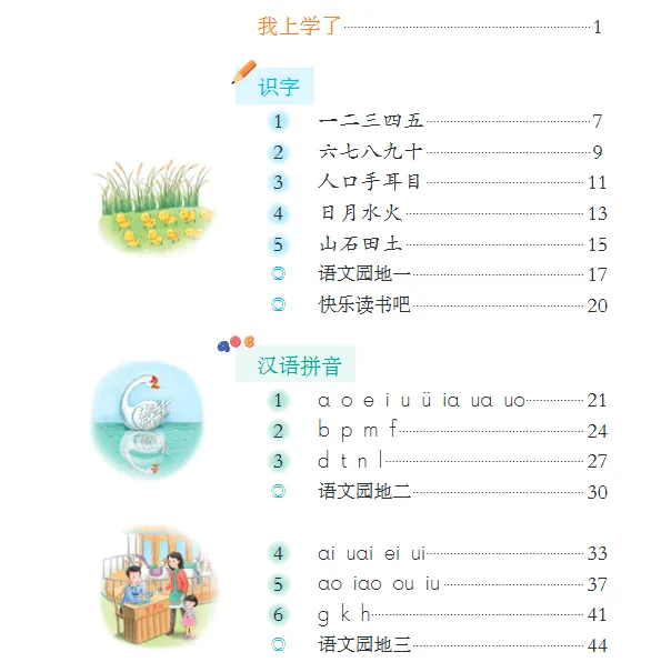 1.基础模块:“我上学了”(校园交际、校园事物)、识字单元(数字、人体部位、自然事物)。
