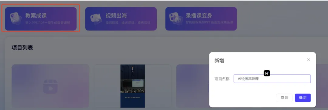 想做一节专属新课,先从创建项目开始。在平台首页功能选择区找到 “教案成课”,点击后输入清晰的项目名称(比如 “AI 绘画基础课”“概率论入门精讲”),方便后续查找管理,确认后就能直接进入编辑页面。