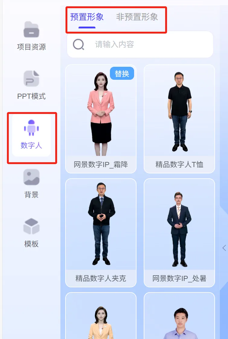 素材准备就绪,该请出你的专属数字人啦!在编辑页面功能区找到 “数字人” 选项,切换到 “非预置形象”,选中上期制作的自定义形象,点击 “替换” 就能完成绑定。