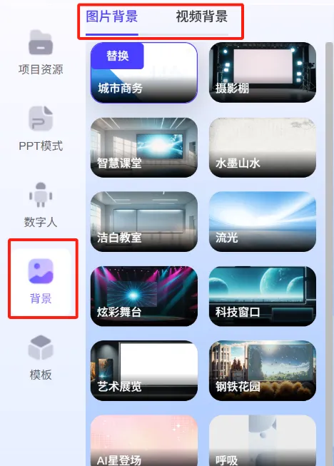 静态图片、动态视频背景都有,点击 “替换” 就能切换当前背景;
