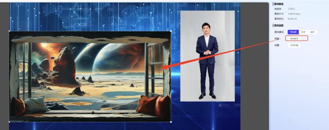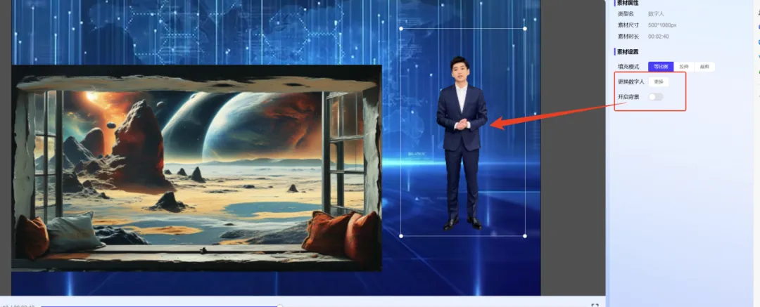 预览区能直接拖动数字人调整位置和大小,属性区还能设置填充模式(等比例 / 拉伸 / 裁剪),让画面更协调;