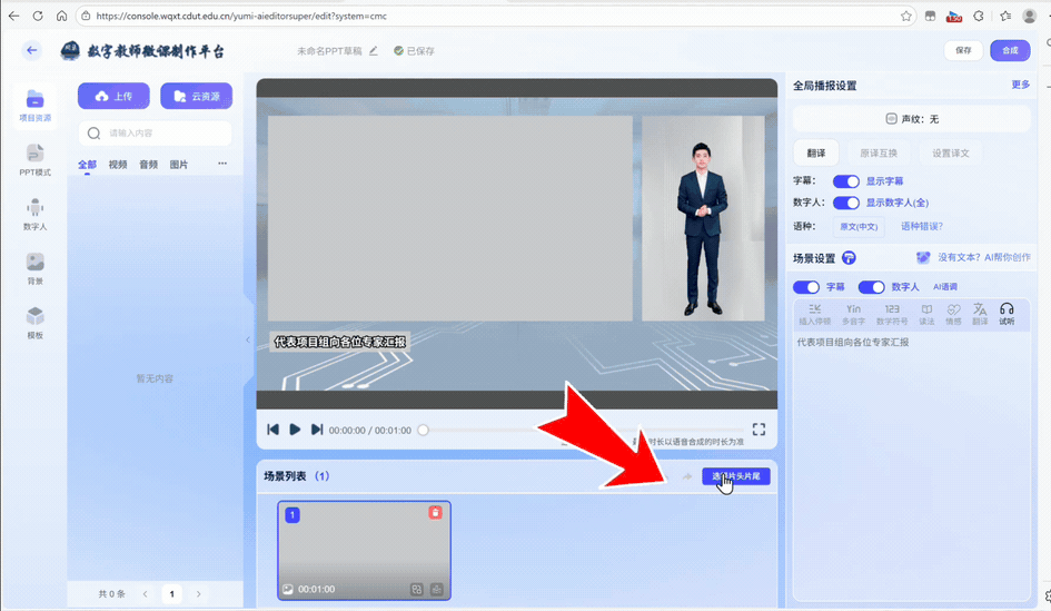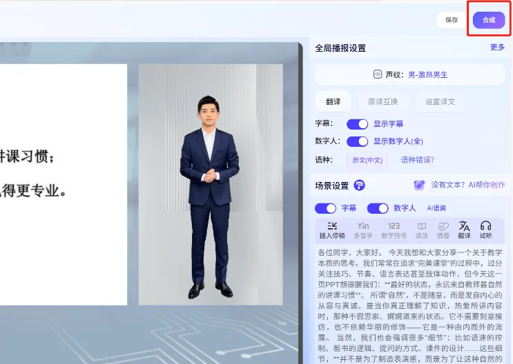 也可使用 AI 工具,它会根据具体ppt页面智能生成文案(新手强推),输入提示词就能生成贴合教学场景的讲稿,应用到对应场景后,你的数字人就会按文案节奏讲解,语气和节奏完全复刻你的风格。创作好后,点击“应用字幕”,导出到具体场景,微课视频中就能出现文案了。