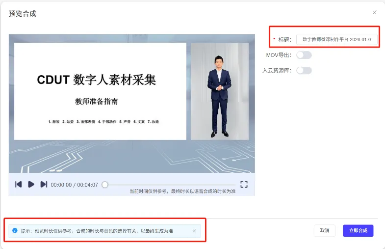 点击 “合成” 就能生成成片,生成前可设置作品标题,选择是否入库(页面显示时长仅为参考,具体时长由语速、声纹、文案决定)。