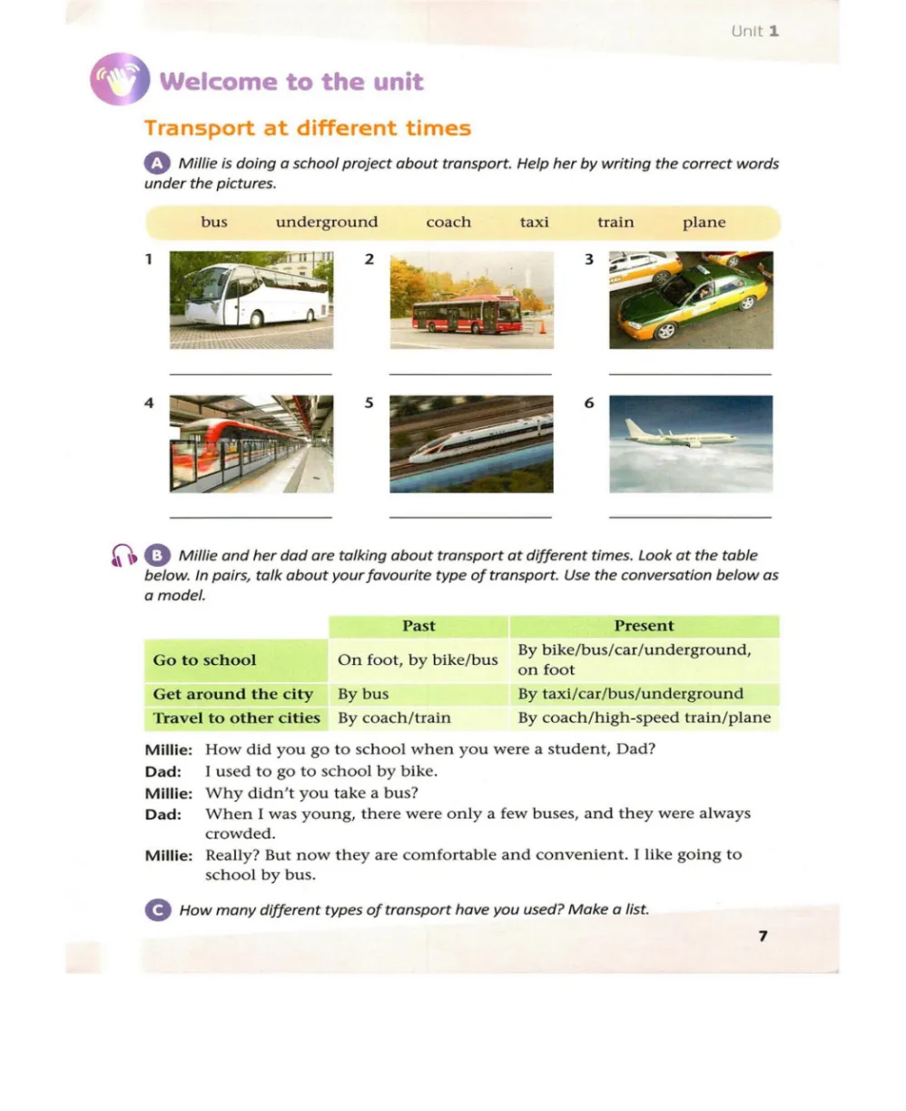 一、重点词汇 1. underground /ˈʌndəɡraʊnd/ n. 地铁 2. speed /spɪd/ n. 速度 3. high-speed train n. 高速列车 4. used to 曾经 5. crowded /ˈkraʊdɪd/ adj. 拥挤的 6. convenient /kənˈviːniənt/ adj. 方便的 | 二、重点词组 1.transport at different times 不同时期的交通 2.used to do sth 过去常常做某事 3.crowded buses 拥挤的公交车 4.comfortable and convenient 舒适又便捷 5.go to school by bus = take a bus to school乘公交车去上学 |