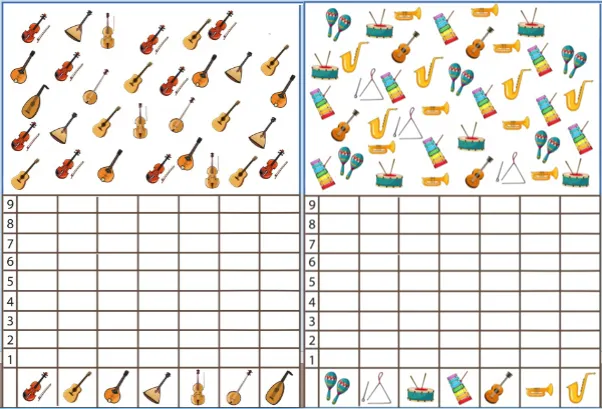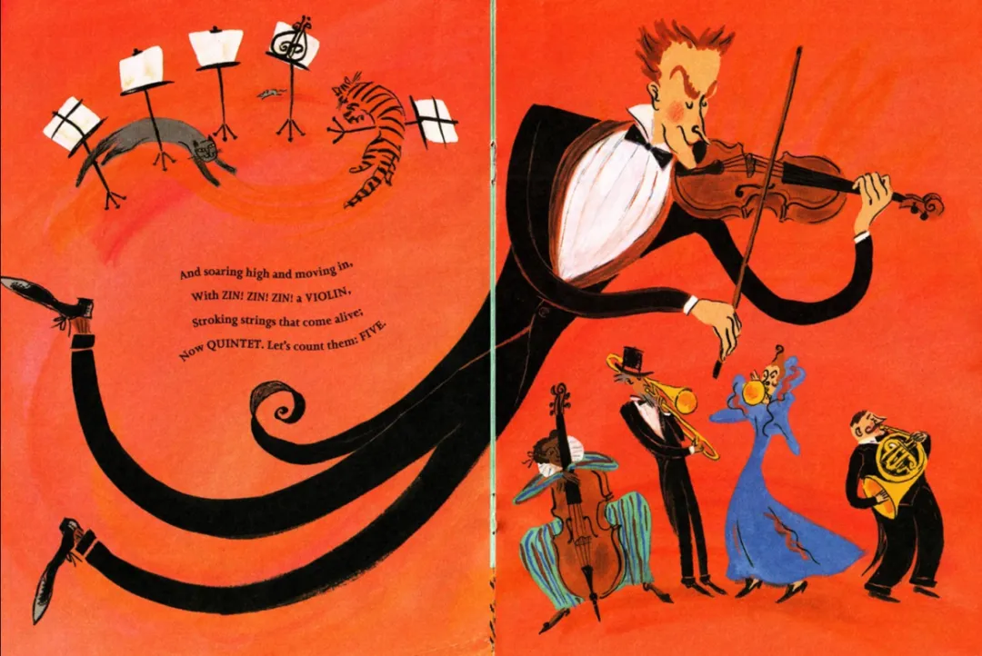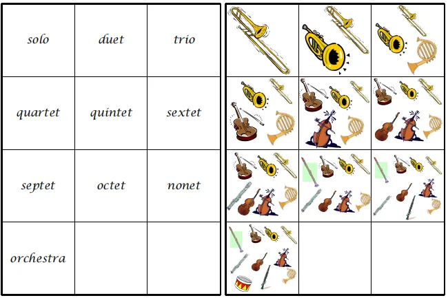 提前带领学生快速回顾绘本里的重奏术语(solo, duet, trio, quartet, quintet, sextet, septet, octet, nonet, orchestra)。每位学生选择一种自己喜欢的乐器并记住对应的英文单词,然后全体学生坐好,老师拿上指挥棒扮演指挥家,随机说出一个重奏术语,如octet,学生需要快速反应并站起来对应人数(8人),喊出各自的乐器单词。站错人数接受惩罚;当人数正确时说出Eight instruments—octet. 然后指挥家指挥乐手用《欢乐颂》的曲调齐声唱Zin! Zin! Zin! Zin! Zin! Zin!
