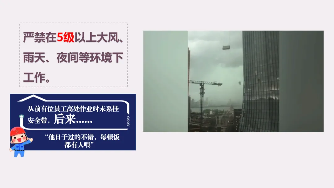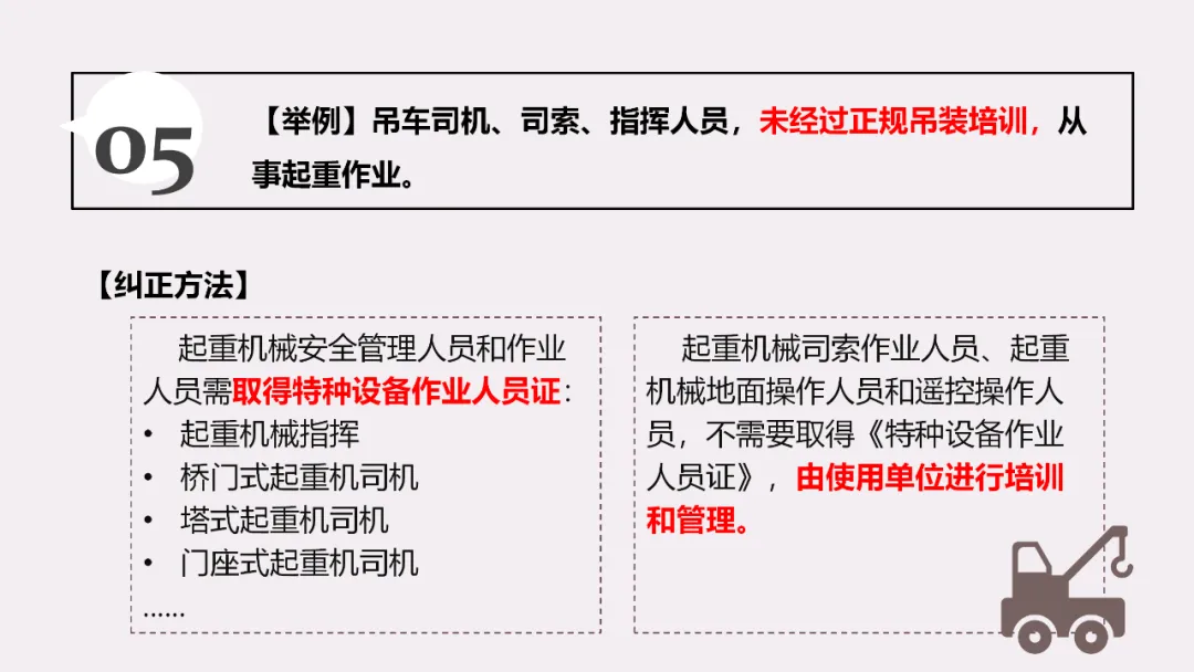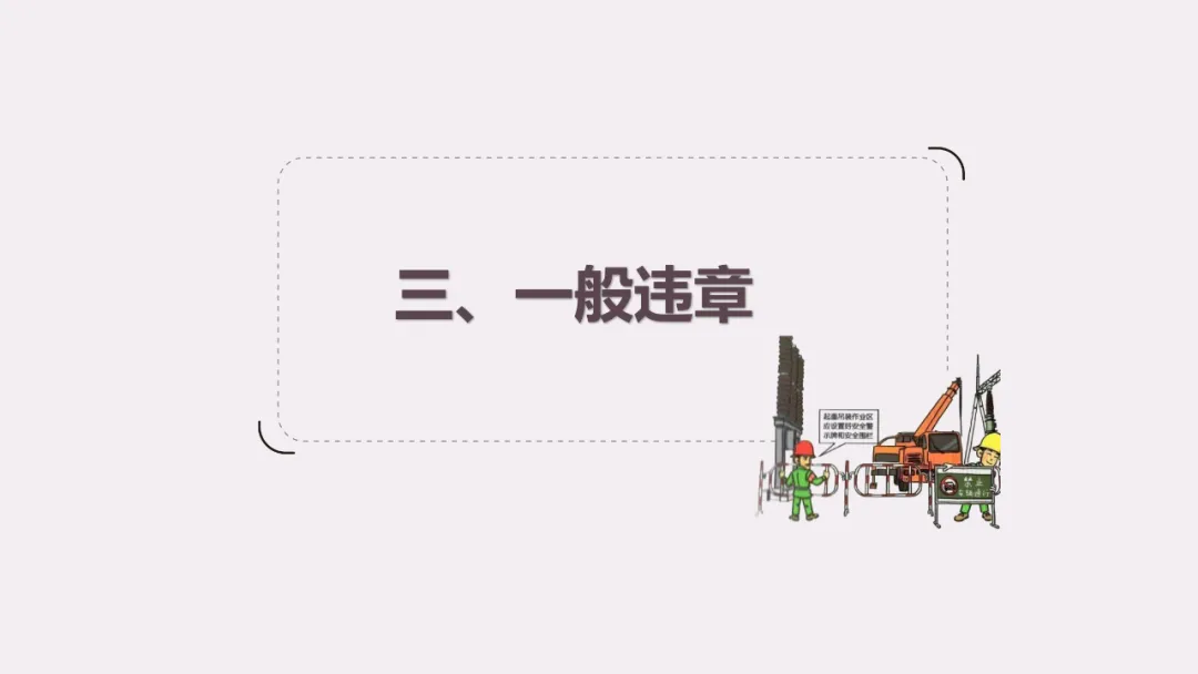 1.吊物下停留或通行:在起重机悬吊着的重物下方停留或通行,或在有可能突然下落的设备下面工作。