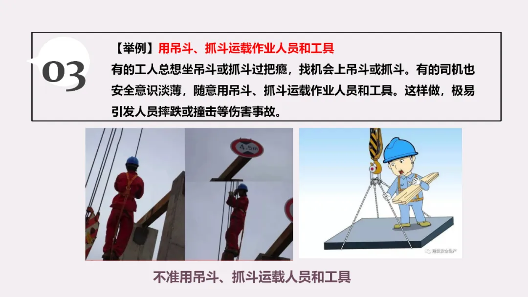 3.用吊斗、抓斗运载作业人员和工具:用吊斗、抓斗运载作业人员和工具,极易引发人员摔跌或撞击等伤害事故。
