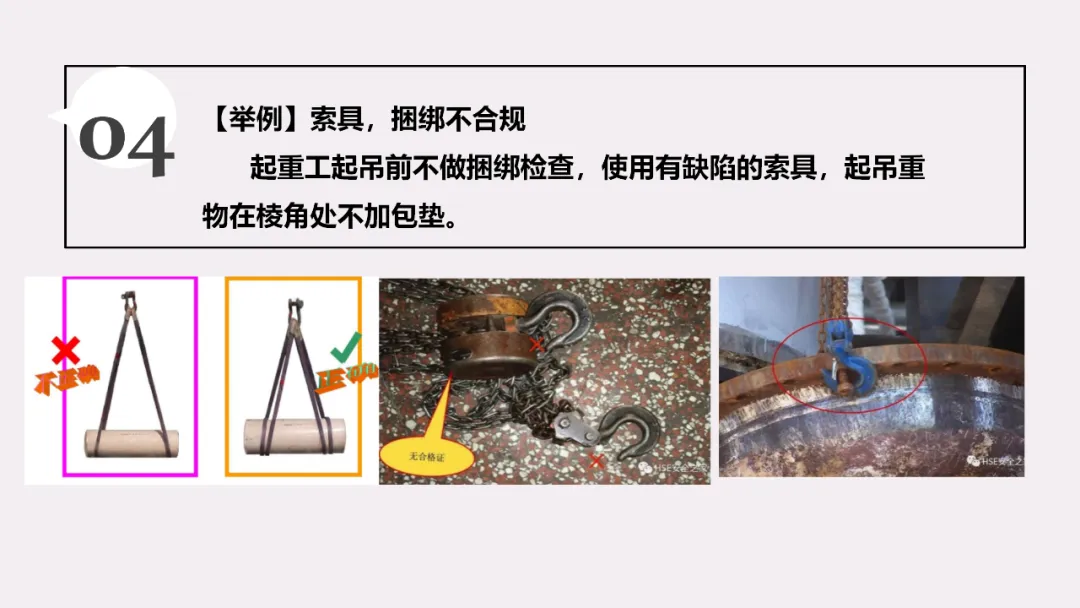 2.索具捆绑不合规:起重工起吊前不做捆绑检查,使用有缺陷的索具,起吊重物在棱角处不加包垫。