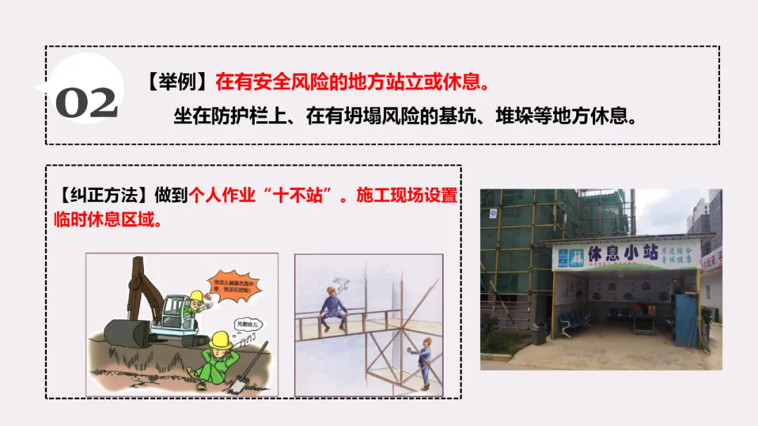 2.在禁止区域站人:在运行吊物下、起重吊臂作业半径下、设备运行或移动轨迹范围内、高处临边、孔洞等区域无安全措施前提下站人。