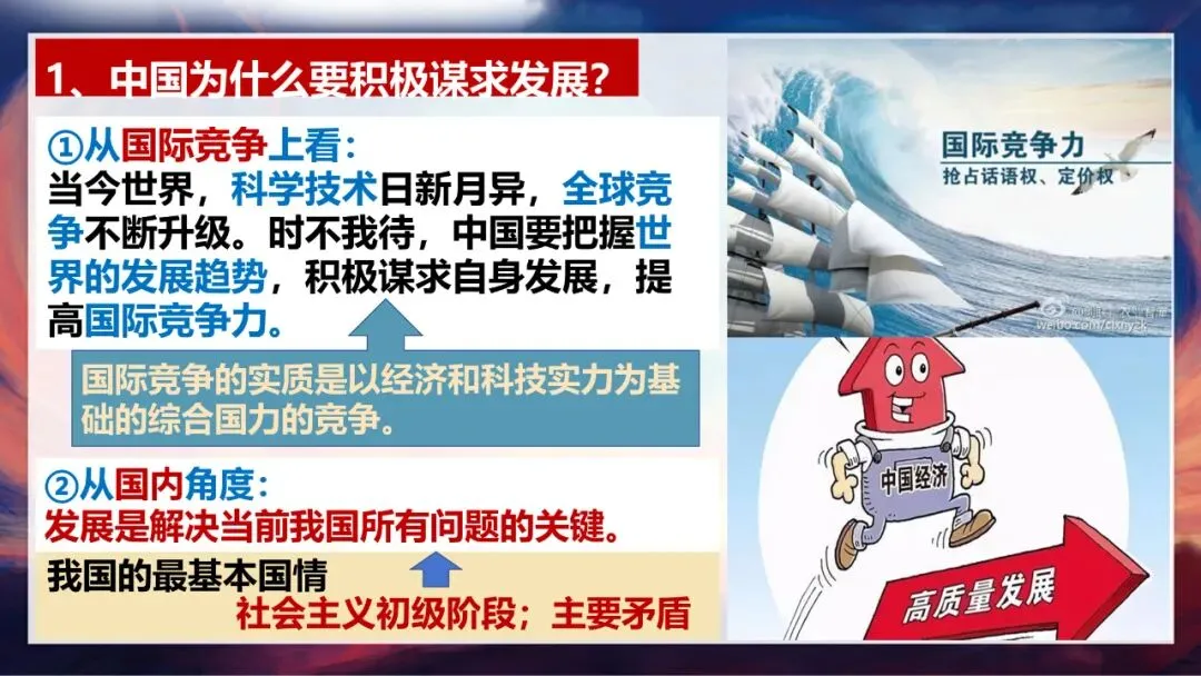 再从国内角度来看,大家还记得我国的最基本国情和主要矛盾吗?(引导学生回答)没错,我国仍处于并将长期处于社会主义初级阶段,当前社会的主要矛盾是人民日益增长的美好生活需要和不平衡不充分的发展之间的矛盾。而发展是解决当前我国所有问题的关键,只有通过持续发展,才能不断满足人民的需求,实现国家富强、民族振兴。