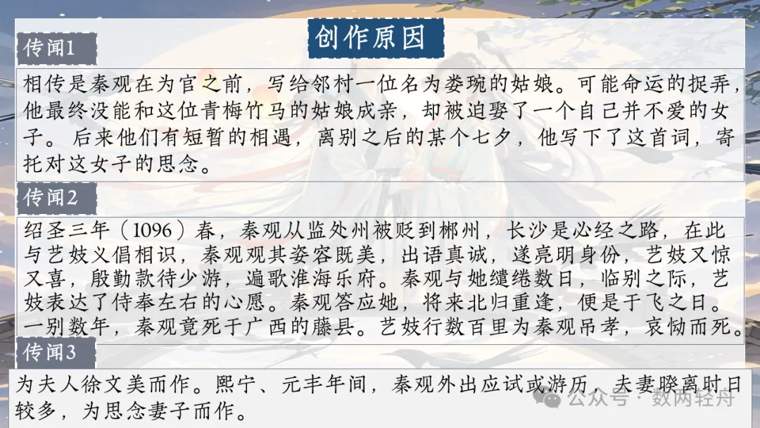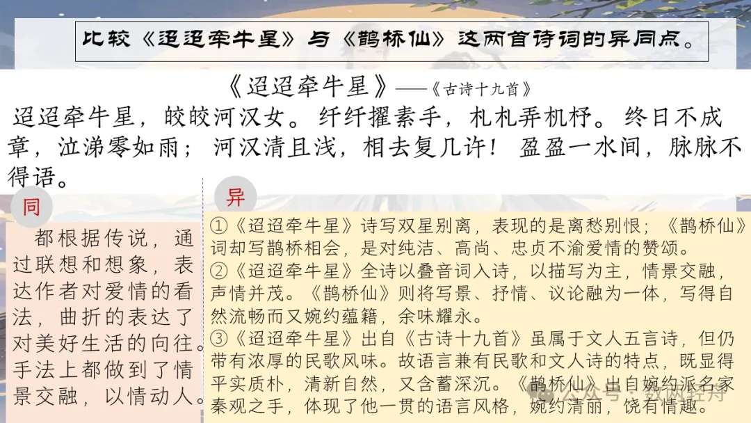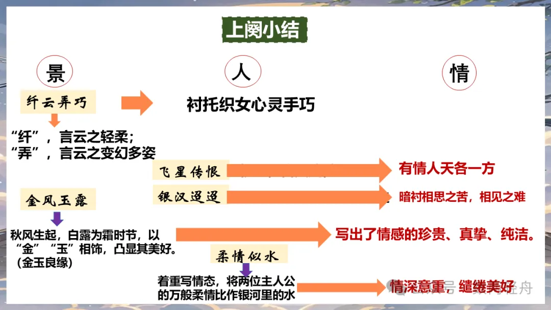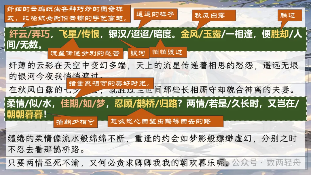 纤薄的云彩在天空中变幻多端,天上的流星传递着相思的愁怨,遥远无垠的银河今夜我悄悄渡过。在秋风白露的七夕相会,就胜过尘世间那些长相厮守却貌合神离的夫妻。