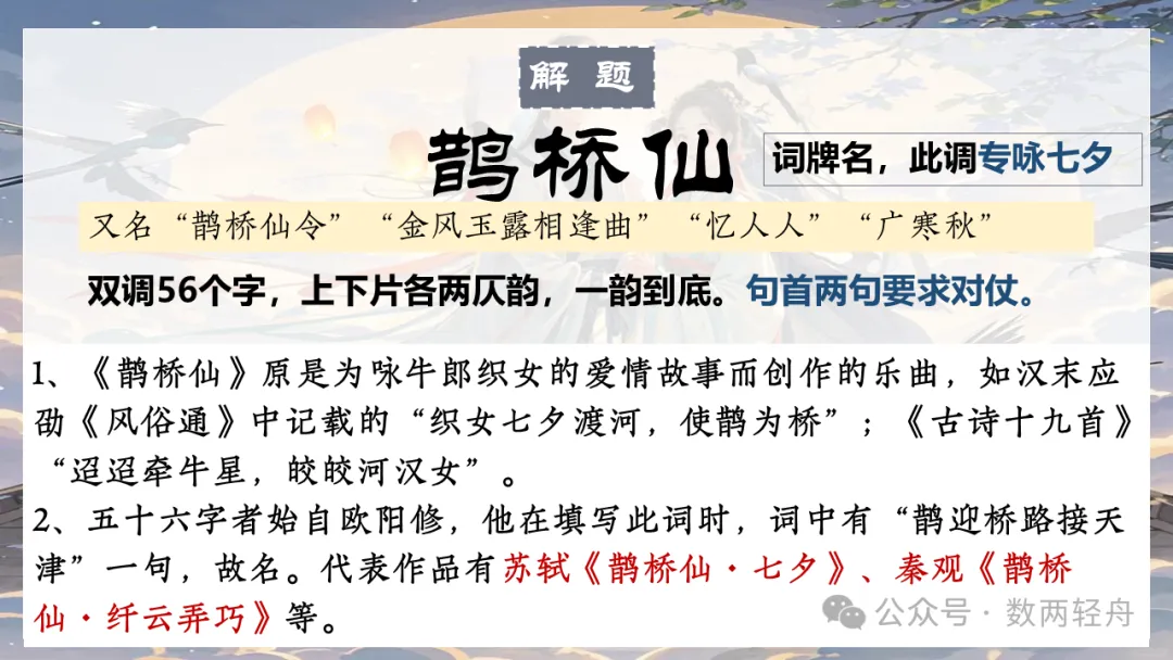 鹊桥仙:词牌名,又名“鹊桥仙令”“金风玉露相逢曲”等。双调五十六字,上下片各两仄韵,一韵到底。上下片首两句要求对仗。纤云:轻盈的云彩。