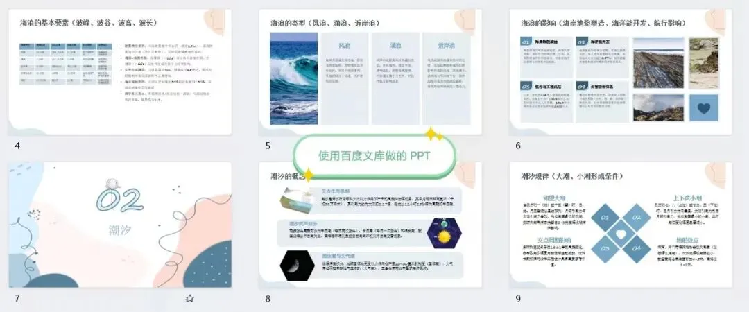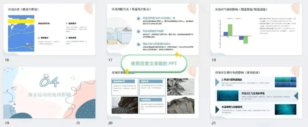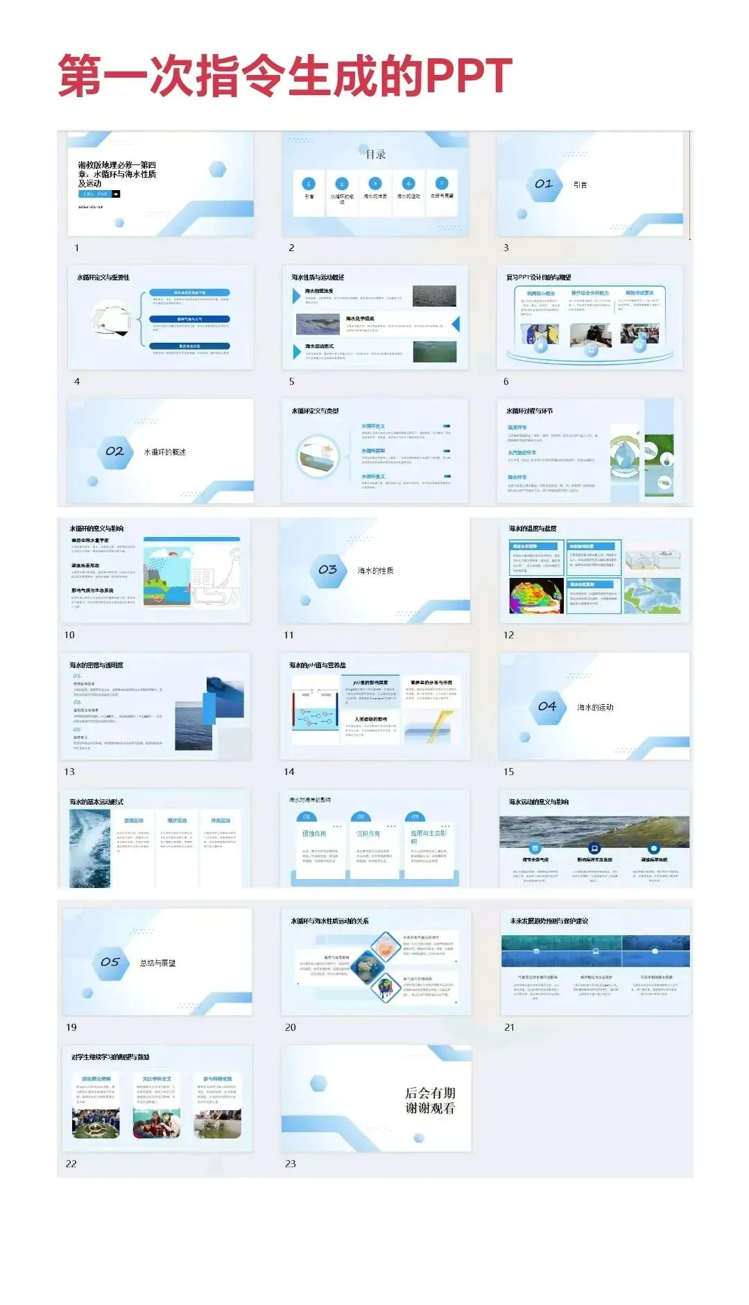 为了对比,我用与昨天类似的指令,让百度文库生成同一节“海水的运动”课件。结果发现: