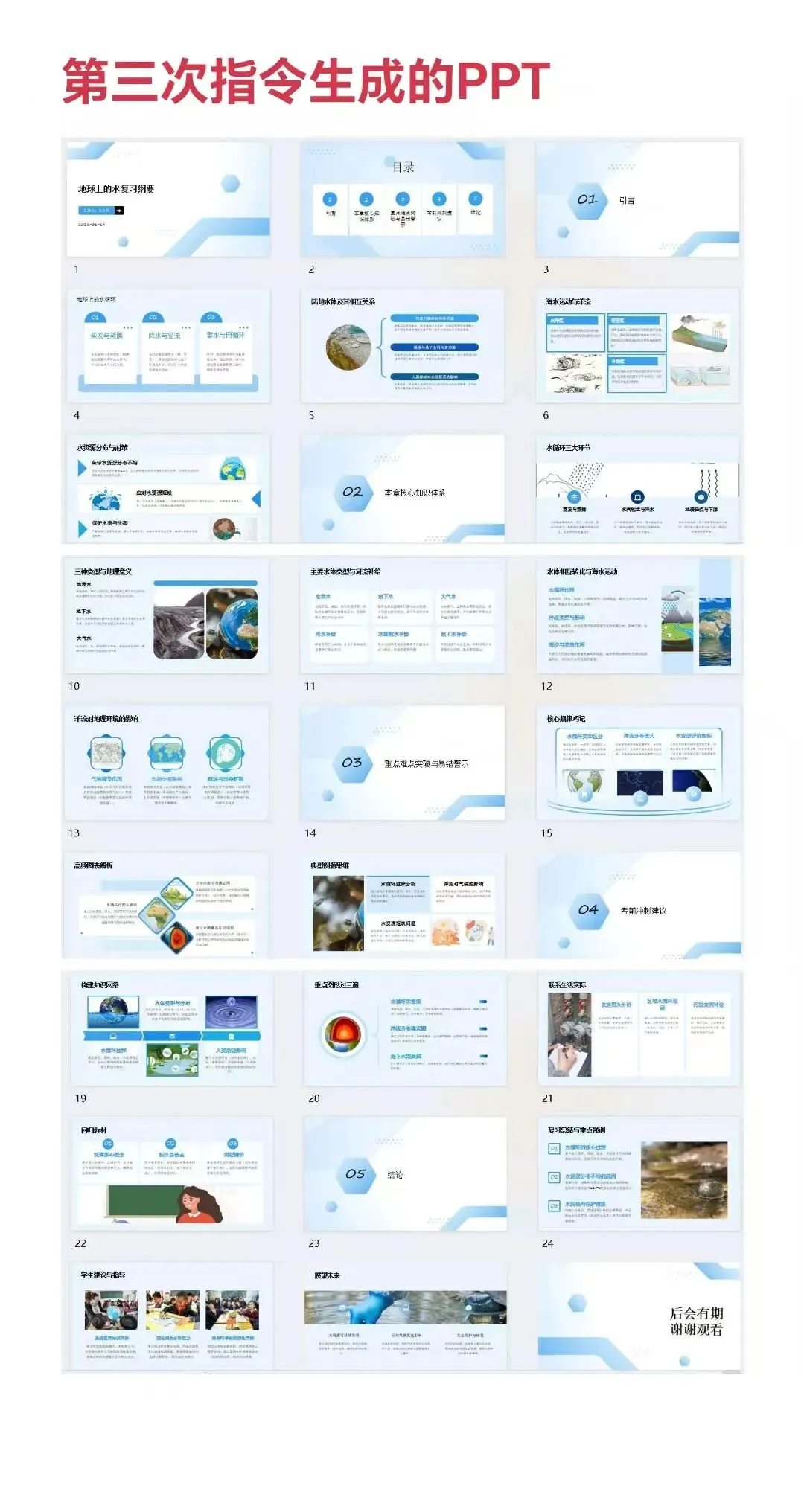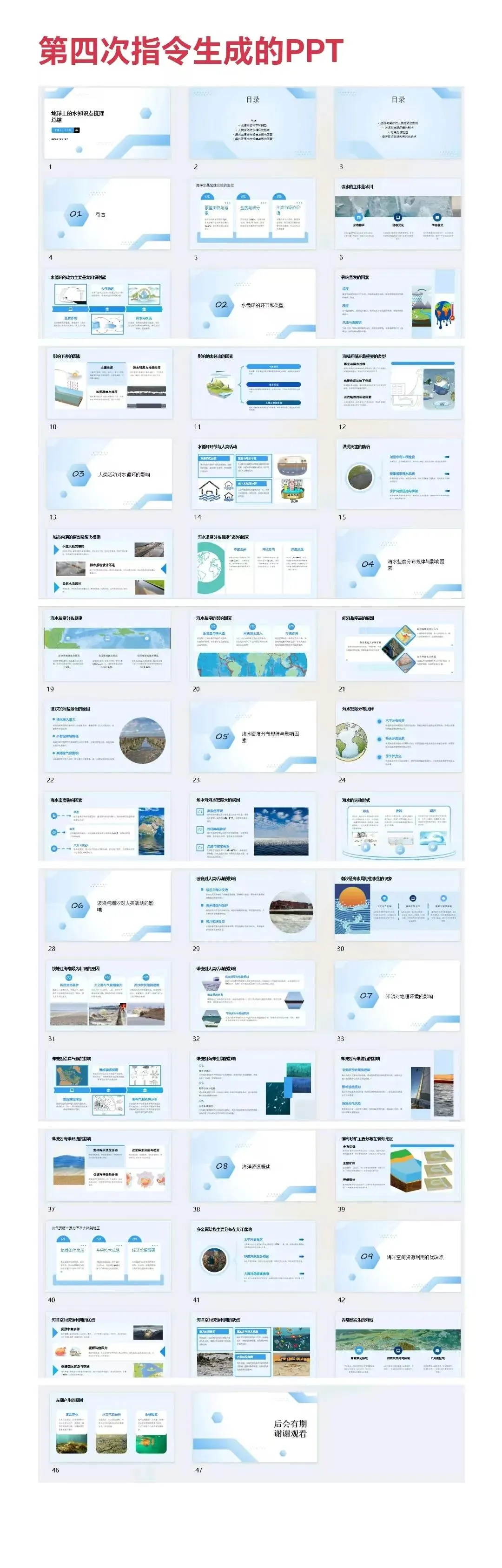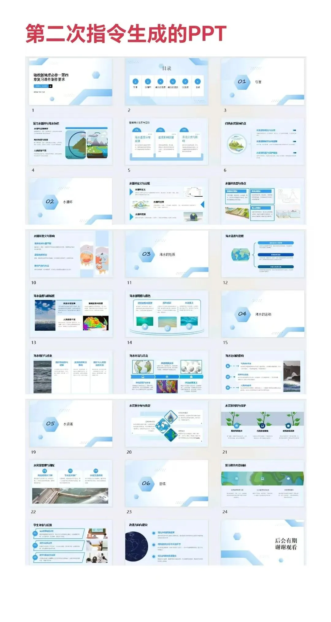 接着,我尝试用百度文库制作湘教版地理必修一第四章《地球上的水》的复习课件,并经历了四次指令优化: