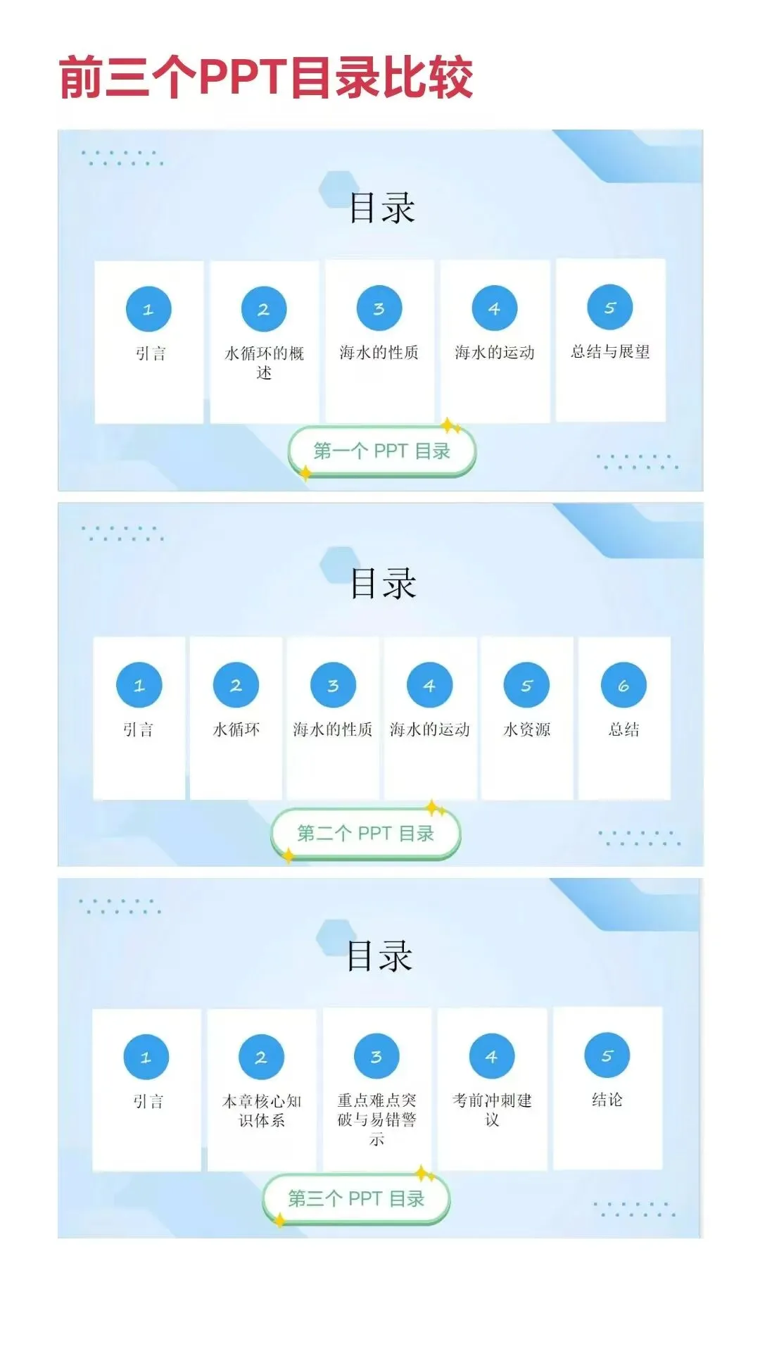 这次内容更聚焦了,围绕水循环的过程与意义、海水的三大性质、三大运动及水资源相关内容展开,但依然包含了海水的酸碱度、透明度、颜色以及“学生评价与反馈”“改进方向与建议”等非必要板块。