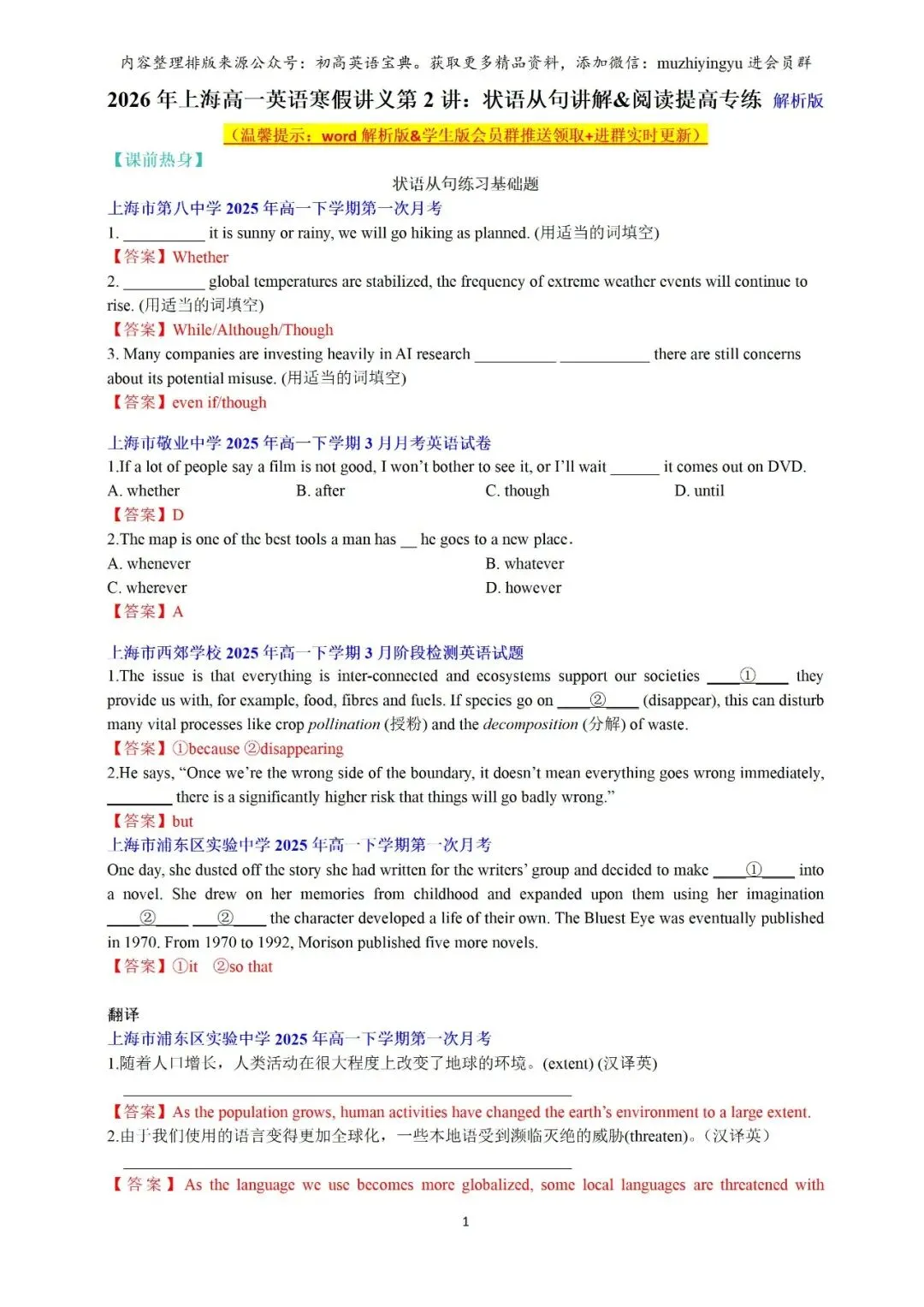 >2026年上海高一英语寒假讲义第2讲:状语从句讲解&12月月考卷
