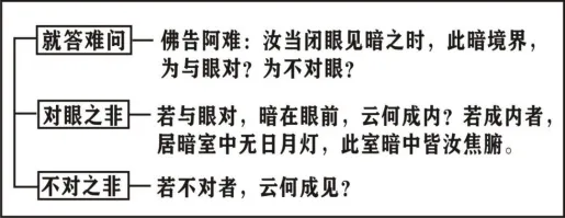 佛告阿难:汝当闭眼见暗之时,此暗境界,为与眼对?为不对眼?若与眼对,暗在眼前,云何成内?若成内者,居暗室中无日月灯,此室暗中皆汝焦腑。若不对者,云何成见?