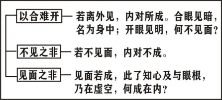 若离外见,内对所成。合眼见暗,名为身中;开眼见明,何不见面?若不见面,内对不成。见面若成,此了知心及与眼根,乃在虚空,何成在内?