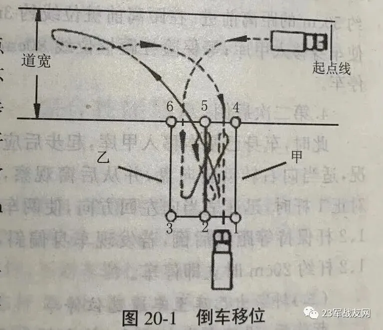 蝶形倒车虽然因不同车型(指挥车、载重车、装甲运输车等)、轴距和车身尺寸不同,但动作都是三步完成即:第一步,右侧倒库(进入乙库);第二步,移库操作(两进两退);第三步,左侧倒库(进入甲库)。