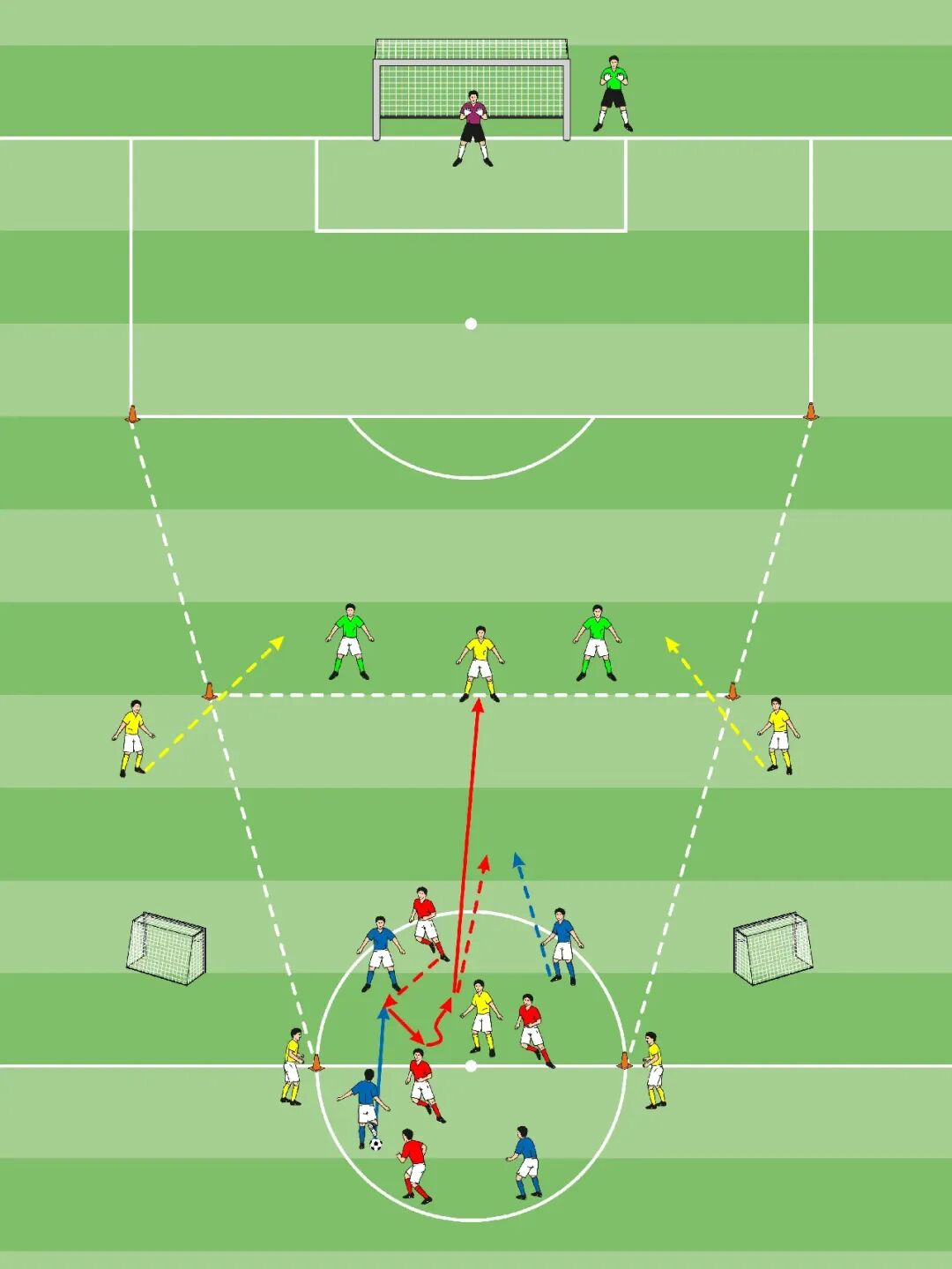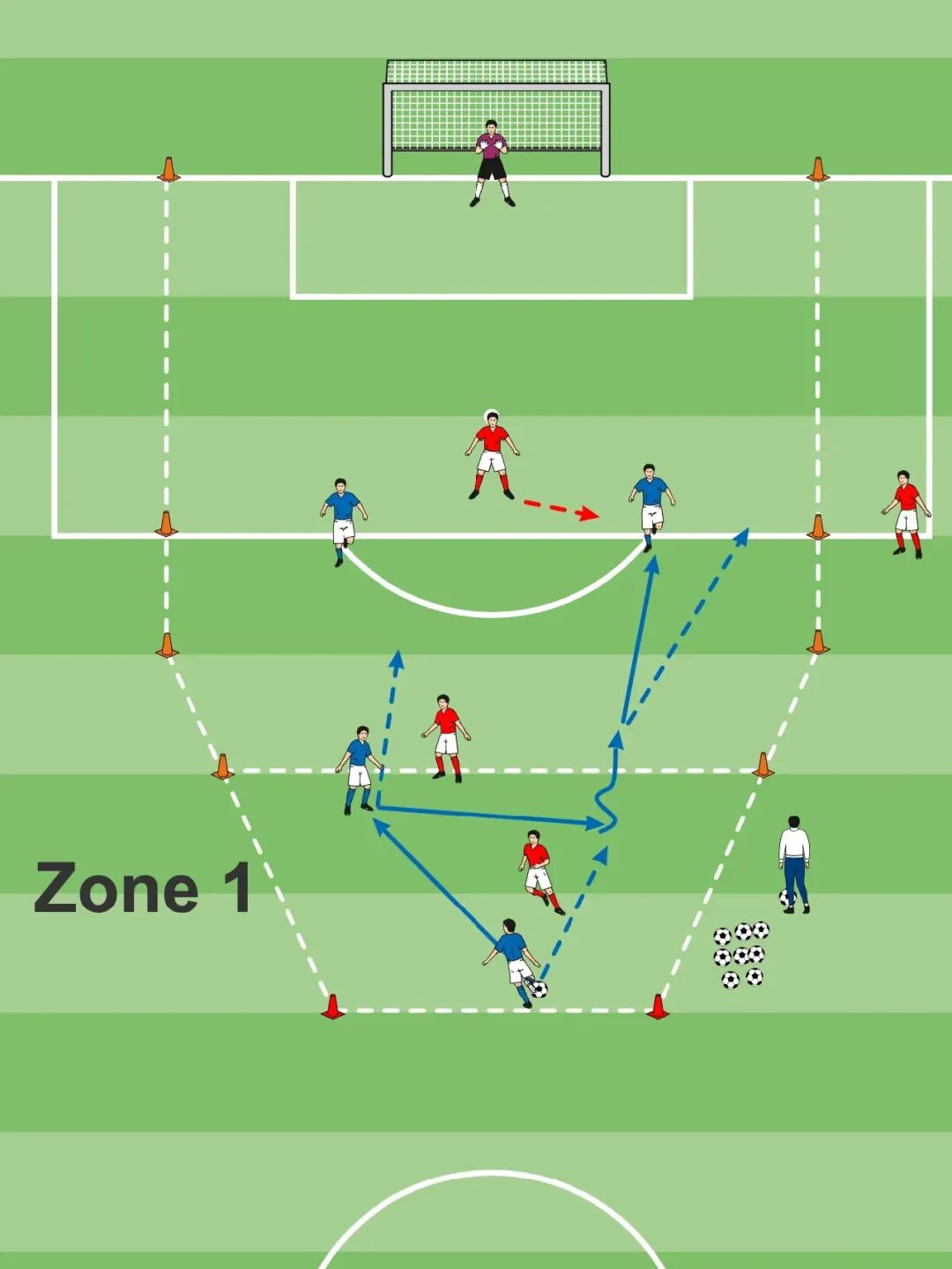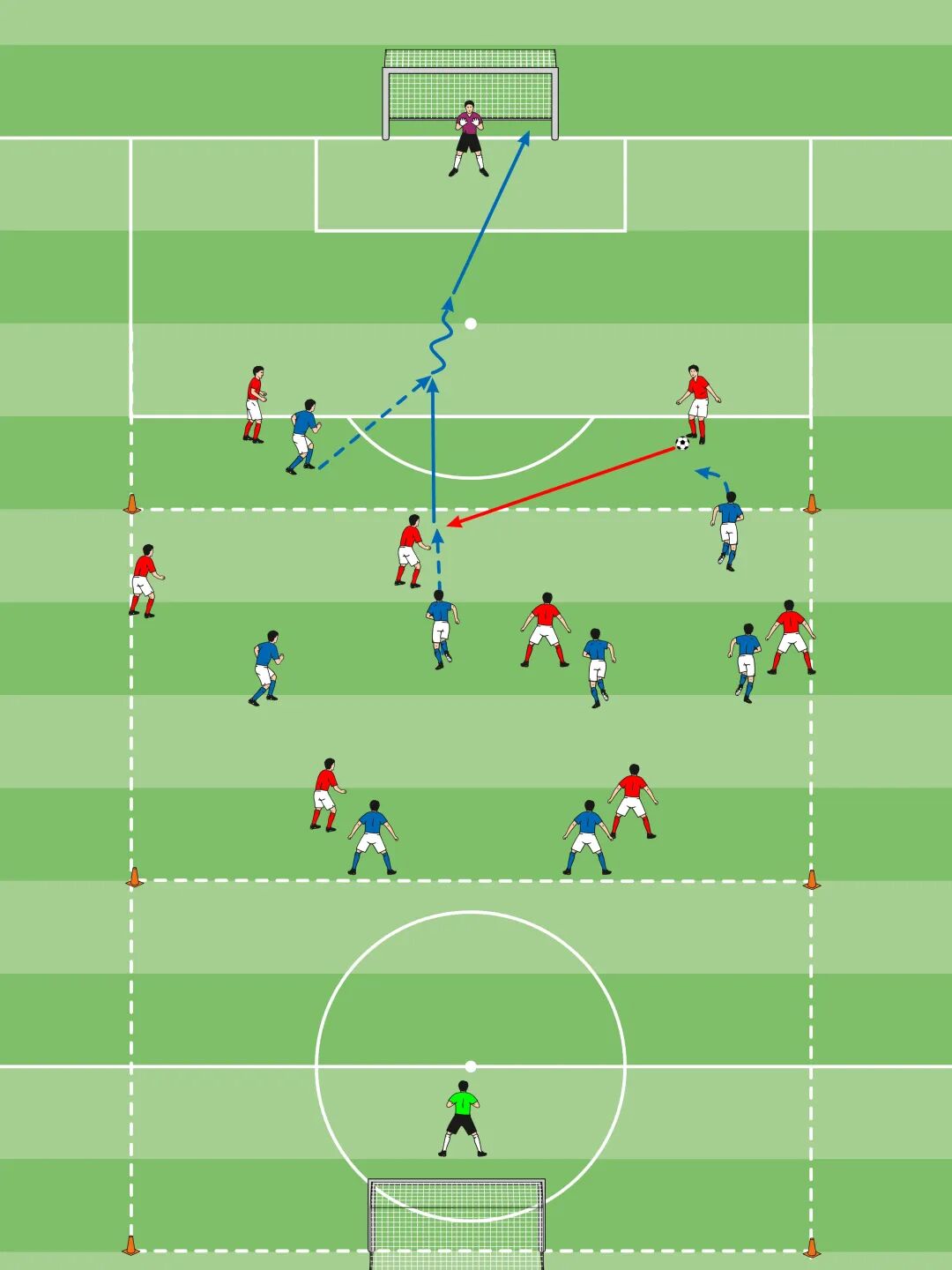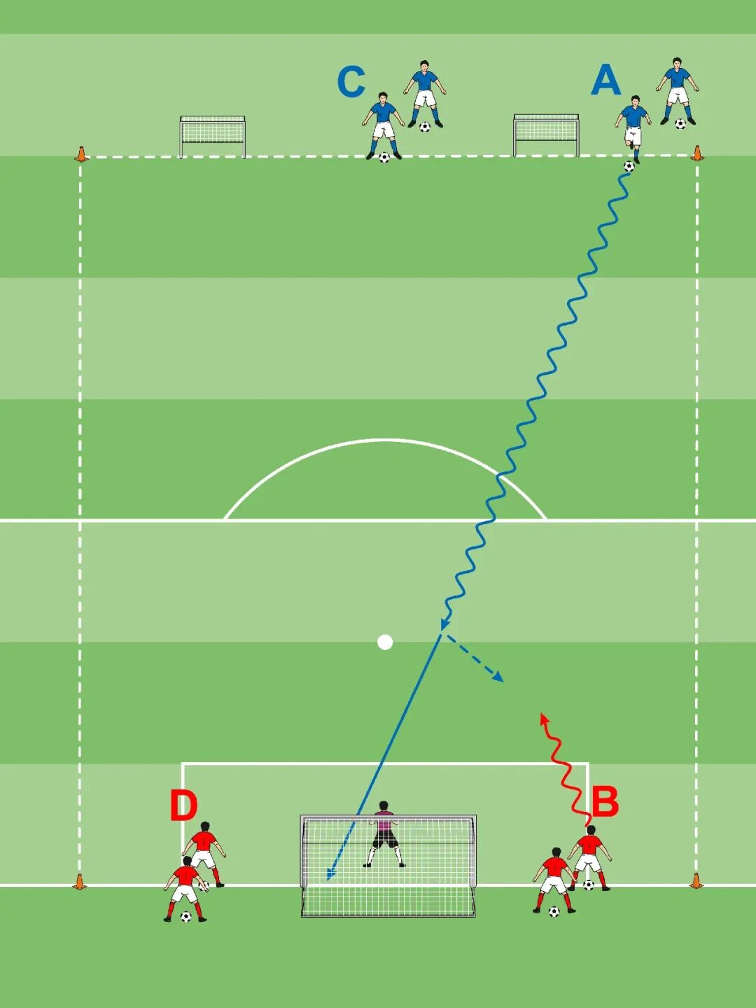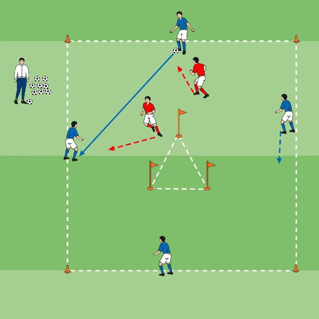 • 蓝队的目标是带球进入进攻区,进行4对3进攻球门