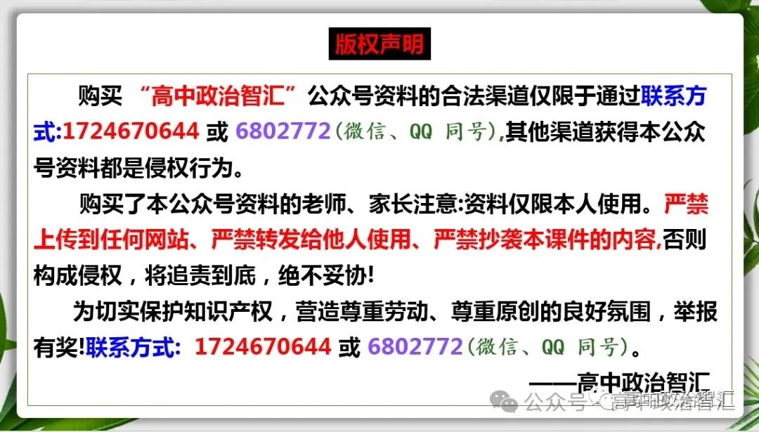 2026高考政治●大单元二轮复习课件(资料) 1.资料特点: ①以时政热点切入专题,链接教材分析,直面命题热点。 ②跨单元、跨模块整合,纵横捭阖,目随纲举,融会贯通。 ③高质量演练过关。高切合度真题和权威模拟,解题过程可视化。 ④二轮复习时间极其有限及重点不在于罗列知识点,课件上不再大篇幅罗列知识要点,但与之配套的逐字稿上会保留较详细知识点和相关的历年真题,有条件的学校可把逐字稿印刷给学生。 2.资料构成:主资料+辅助资料 主资料:课件+Word版逐字稿+配套练习题; 辅助资料:知识总结+主观题模板+真题汇编+易错易混点。(Word版) 3.温馨提示:各位老师一定要根据自己的学情进行二次备课,对课件内容稍作调整(增添或删减),我们做课件更多考虑普遍性、通用性,特殊性需要诸位老师自行处理。总之,世界上不存在完全适合所有老师的课件,众口难调! 4.购买资料唯一渠道:加微信1724670644 或6802772;若发现其它渠道贩卖本资料请联系我们,万分感谢! |
