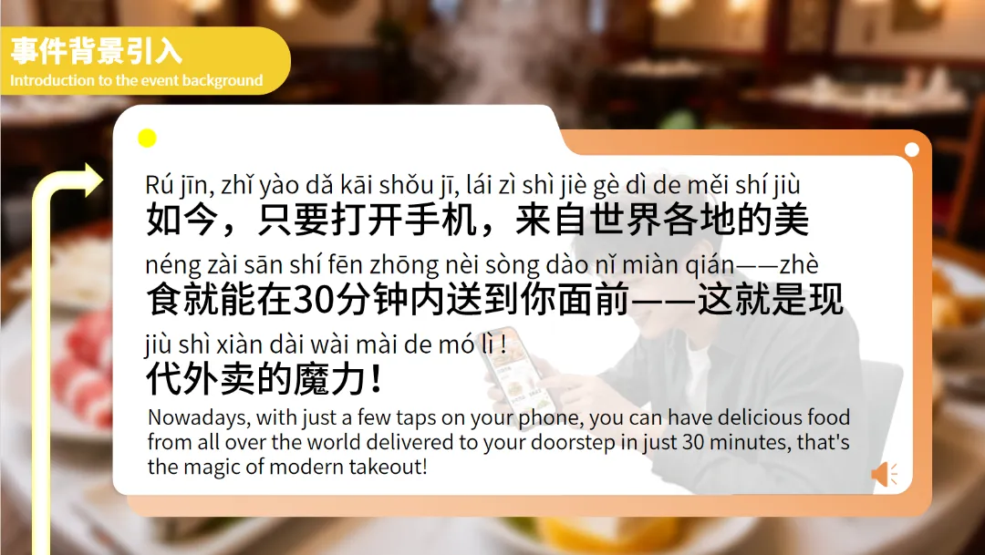 课件以一个生动的场景开始,展示了现代外卖服务的便捷性。通过一段描述,学生可以了解到,如今只需轻点手机,就能在30分钟内享受到来自世界各地的美味佳肴。