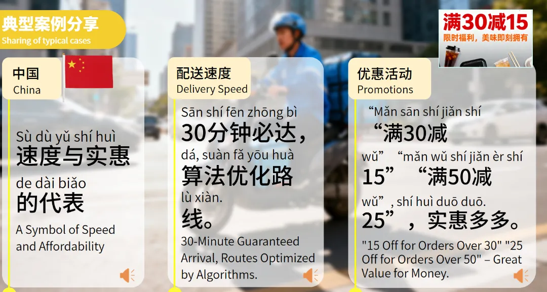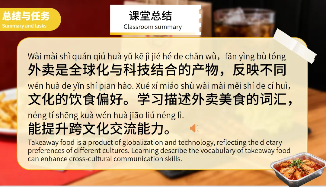 为了帮助学生学习和掌握与外卖相关的汉语词汇和表达方式,我们特别推出了“全球外卖美食”课件。