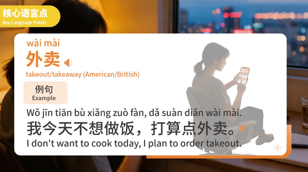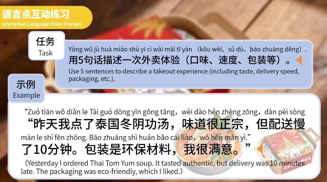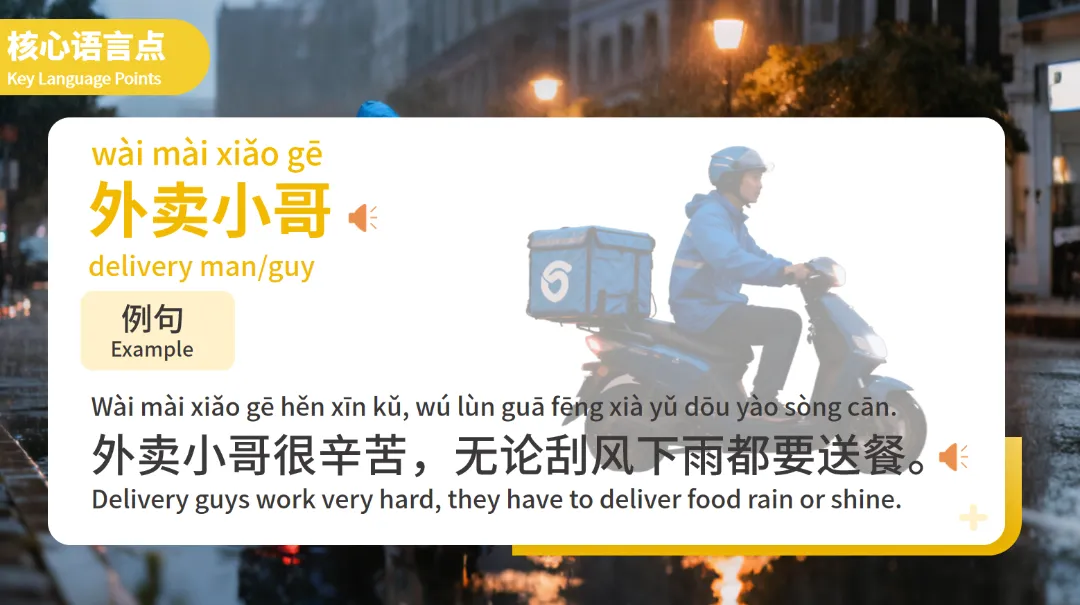 例如,“我今天不想做饭,打算点外卖”和“外卖小哥很辛苦,无论刮风下雨都要送餐”等句子,帮助学生掌握相关词汇和表达方式。