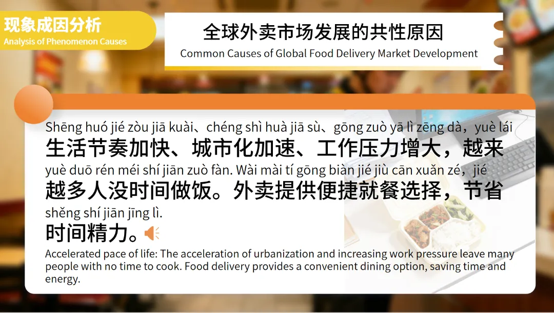 课件进一步分析了全球外卖市场发展的共性原因。生活节奏加快、城市化加速和工作压力增大,使得越来越多的人选择外卖作为便捷的就餐方式。