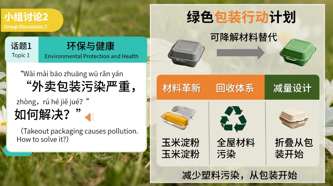 最后,课件引导学生思考外卖包装污染的问题,并提出解决方案。