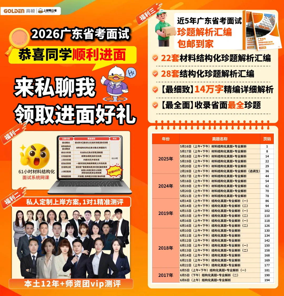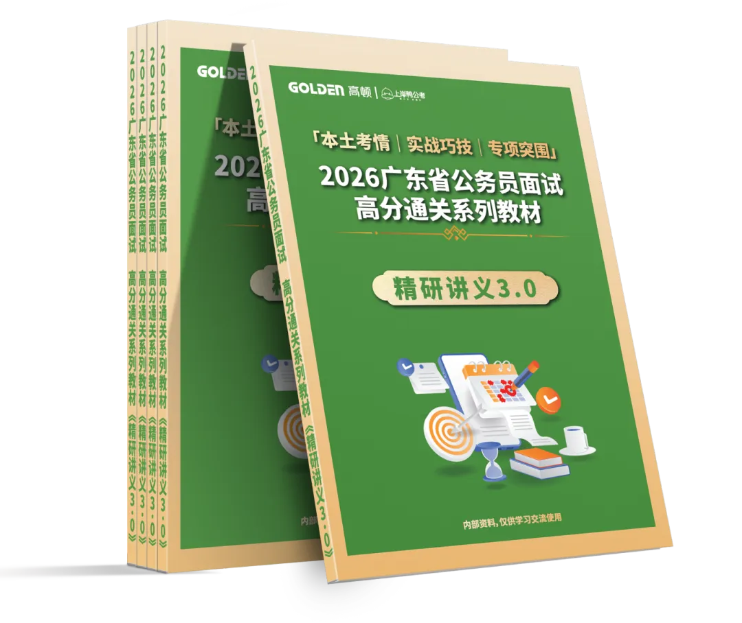 由20名深耕广东省考面试教研领域10年以上的资深讲师,联合3名体制内工作经验超过8年的实务顾问,历时180天专项攻坚、累计投入超1000小时研发工时打造的精品教研成果,其在审题、审材料维度的深度研发与题目选用,充分彰显了团队强劲的教研硬实力,精准契合广东省考面试核心考情。