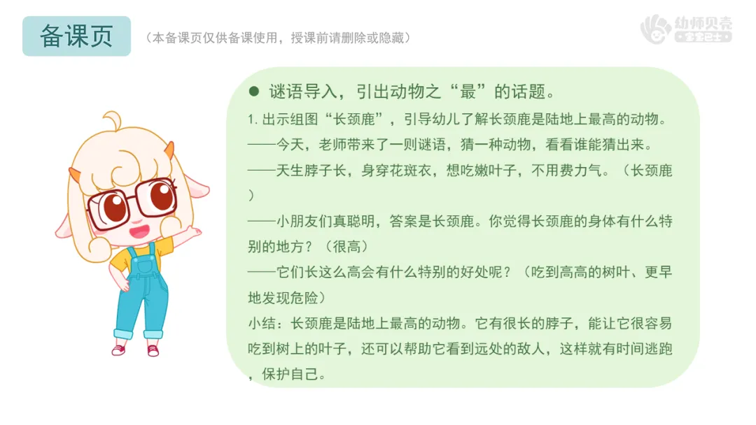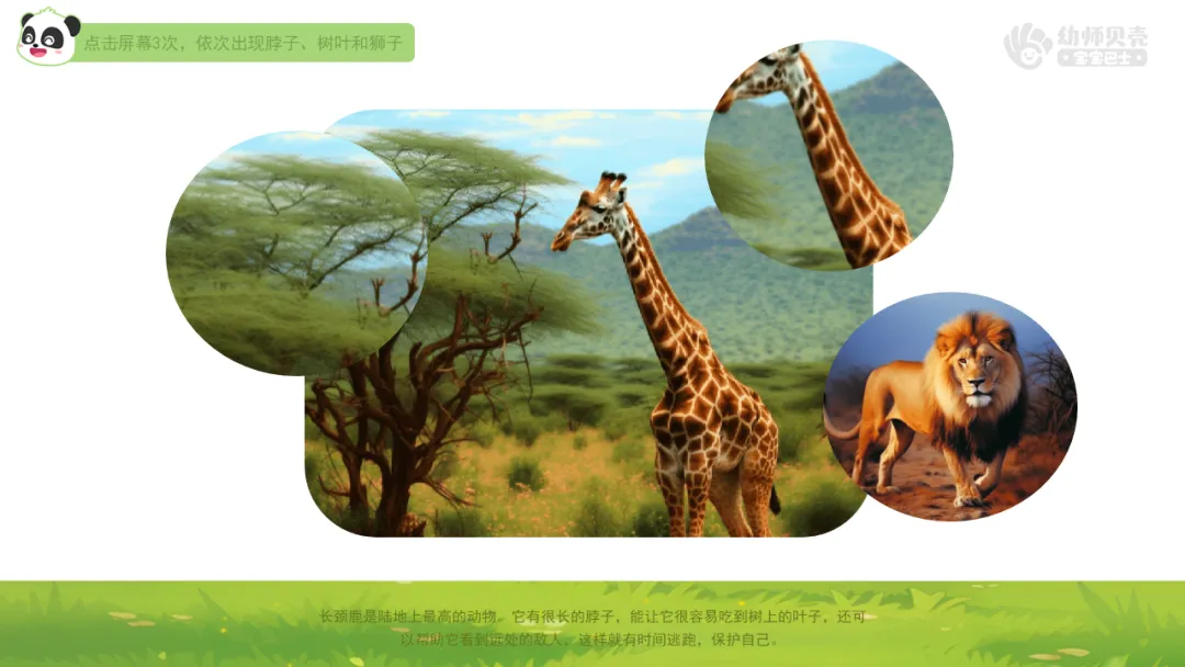 l课件准备:“长颈鹿”图片;“动物之最”音频及组图;“戳泡泡”音频及组图。
