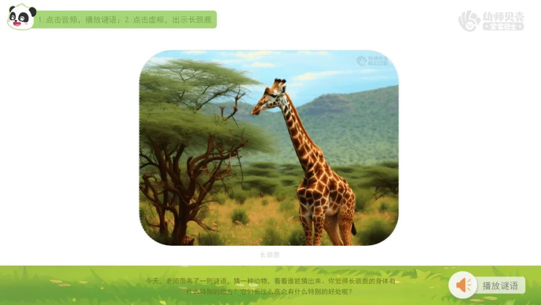 ——小朋友们真聪明,答案是长颈鹿。你觉得长颈鹿的身体有什么特别的地方?(很高)