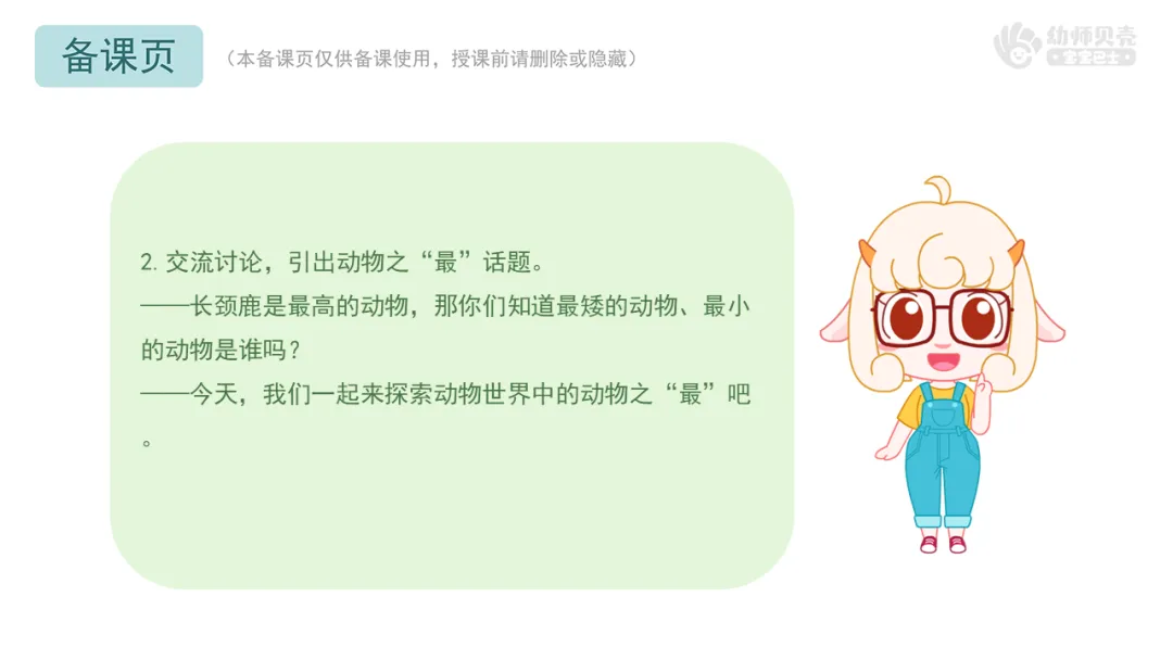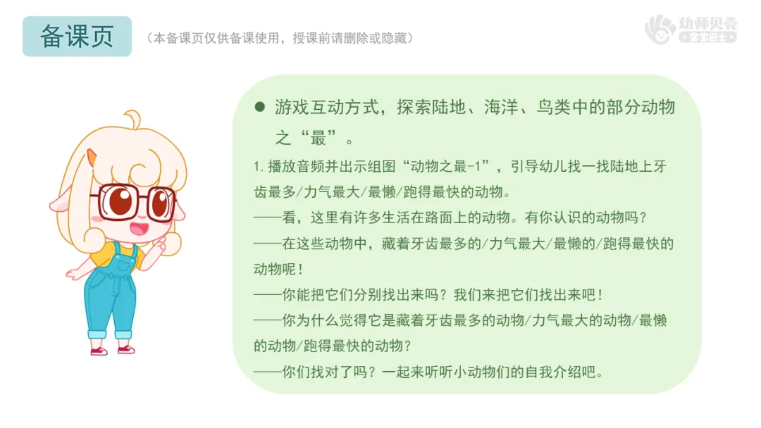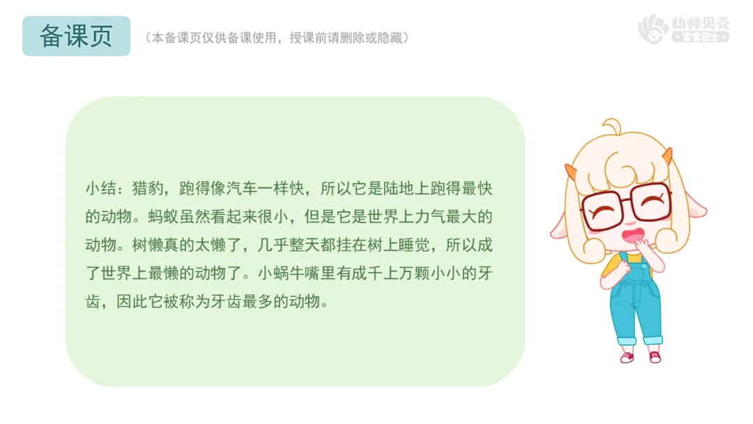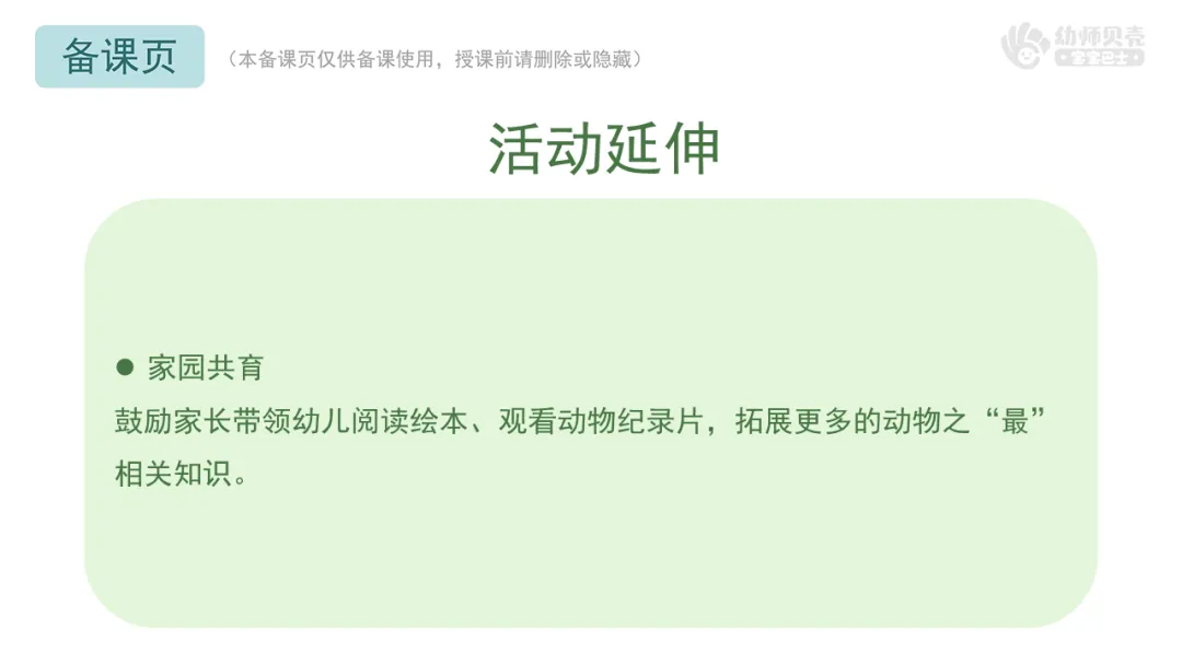 ——今天,我们了解了动物世界里的部分动物之“最”,小朋友们回家后可以和爸爸妈妈再一起找一找更多的动物之“最”哦。