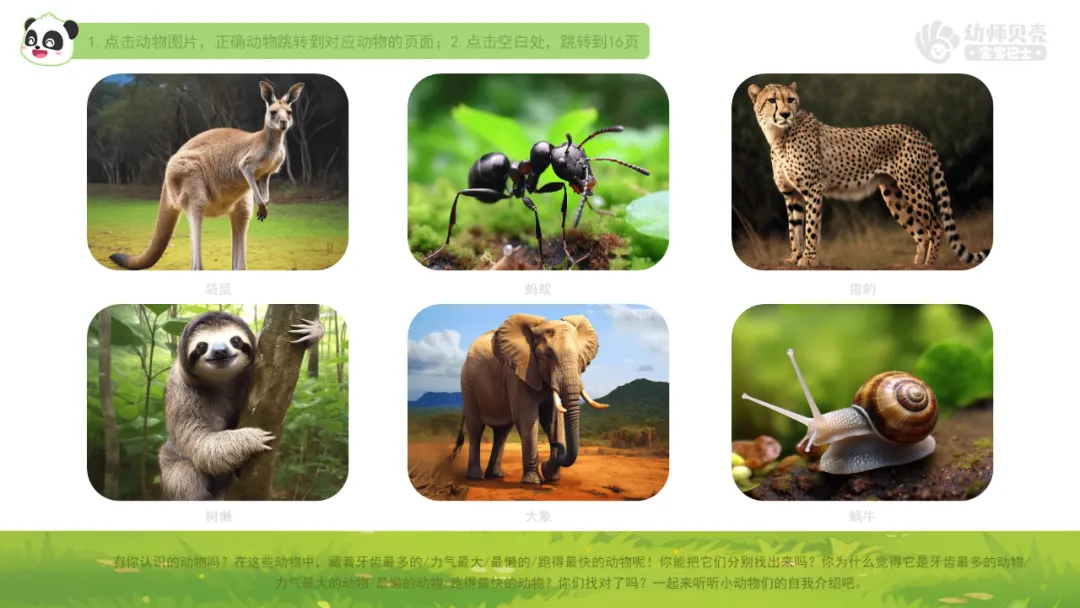 l游戏互动方式,探索陆地、海洋、鸟类中的部分动物之“最”。